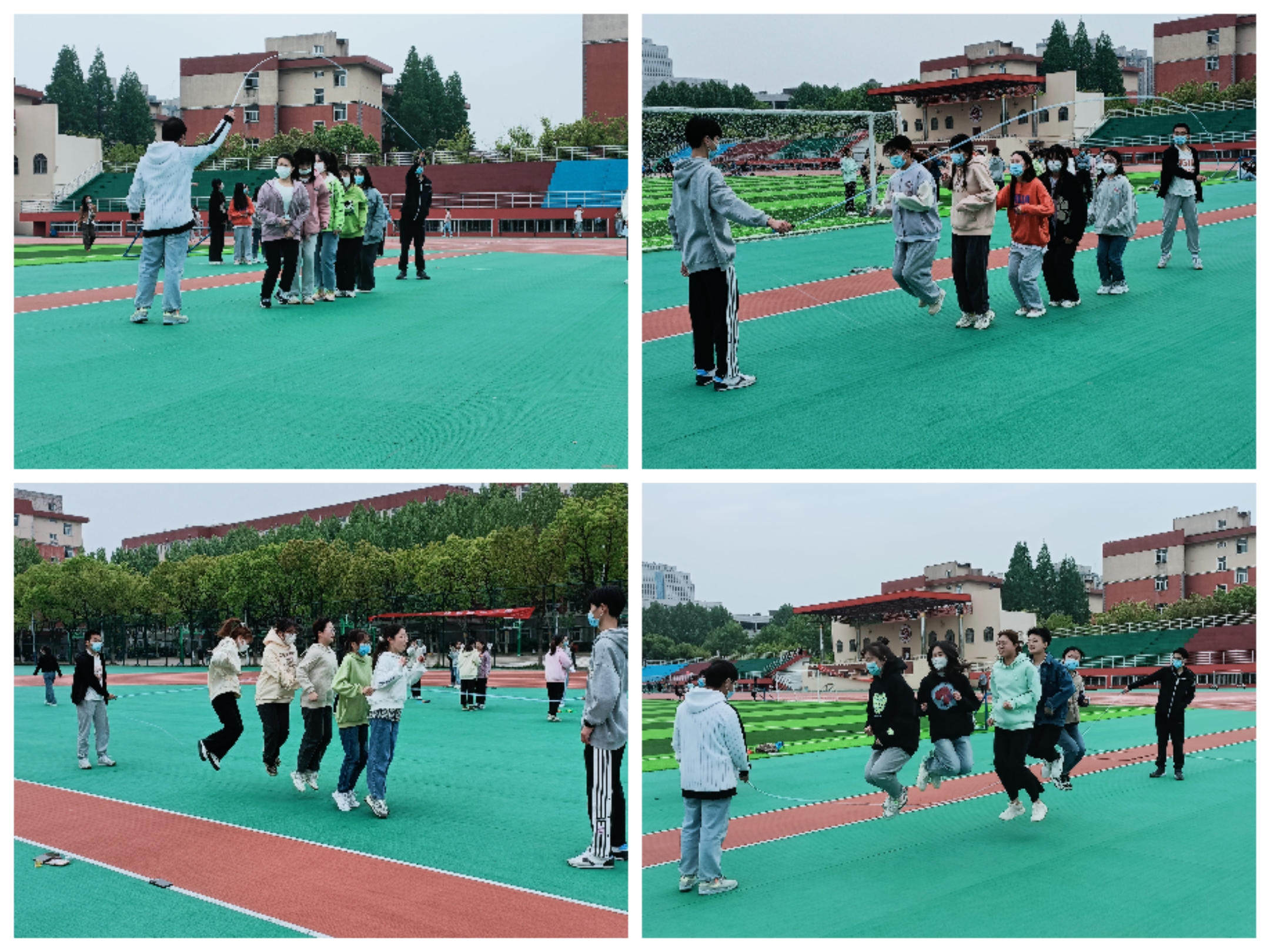 下午4点,“一起摇摆,健康同行”趣味跳绳比赛在第一田径场举行,有双人跳绳、五人跳绳等多种方式。小小的跳绳舞出了呼呼风声,荡漾着青春笑脸,加油声、叫好声在运动场上此起彼伏。