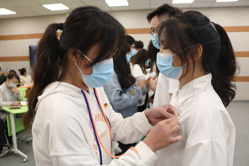 在嘹亮的国歌声后,学院团委副书记严煌宣读院团委《关于吸收刘佳慧等五名同学为共青团员的通知》。紧接着在交通执法支队团总支书记郑榕晟带领下,交通执法支队和运管中心团组织的老团员们共同见证下, 5名新发展团员面对团旗庄严宣誓,同时入团介绍人为他们颁发团员证、佩戴团徽。随后,行管212刘佳慧作为新团员代表发言,表达了成为一名中国共青团员的喜悦与激动,决心将肩负起共青团员的责任,为实现中华民族伟大复兴而努力。交通执法支队团总支支委委员王佳漫作为老团员代表发言,向新团员表示祝贺并勉励新团员不仅在组织上入团,更要从思想上、行动上入团。