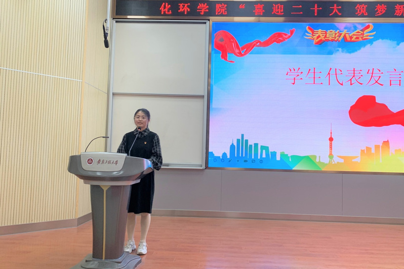 校特等奖学金获得者、安徽省优秀毕业生、学院今年考研最高分418分并被华中科技大学录取为硕士研究生、应化拔尖18级徐英茹作为获奖学生代表发言。她代表全体受表彰同学,感谢对母校的辛勤培养,感恩老师对他们的温暖关怀,毕业既是终点,又是起点,他们将怀着对母校的眷念和对未来的期盼,以行动践行责任,用脚步丈量中国,以爱党爱国之心磨砺报国强国之行,以实际行动将“小我”融入祖国的“大我”之中,贡献青春力量。