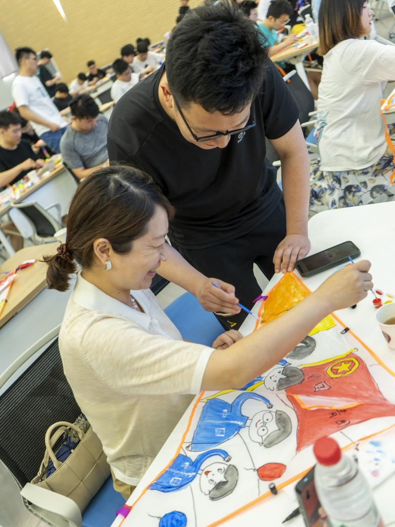 在梦溪才艺展示大厅,近百名同学聚在一起,围绕庆祝五四青年节、喜迎党的二十大、庆祝中国共产主义青年团成立一百周年等主题,在60支空白风筝上自由绘画创作。同学们一笔一画、一色一调,一点不马虎,青年的想象力和创造力通过动手劳动更显的有意义。国际工程师学院校区管委会的老师们也来到现场“凑凑热闹”,与同学们一起用画笔勾勒表达自己的祝福。