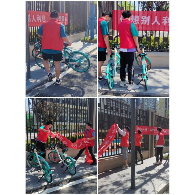 在小队成员和社区工作人员的一起努力下,道路两侧随意摆放的共享单车被搬移至固定的停放点;围栏上贴的老旧横幅也被拆下、回收。在活动开展同时也积极向市民们宣传文明骑行、有序停放、不随意张贴海报或标语的重要意义,并呼吁过往行人自觉做起文明监督员,监督身边的不文明行为。此次活动避免了道路交通隐患,让城市文明归位,让志愿服务成为了市民的自觉行动。