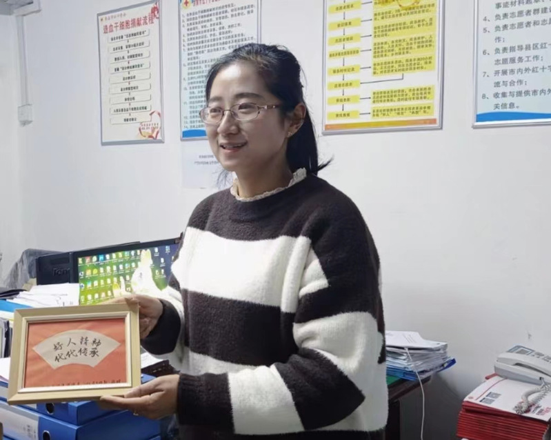 她累计参加红十字会志愿者服务百余次,累计服务时长千余小时,她是安徽省造血干细胞捐献工作者捐献第一人,先后当选“淮南好人”、“安徽好人”。在她的精神感召下,两位寻访员毫不犹豫地填写了红十字会入会申请表,成为了光荣的红十字会志愿者。