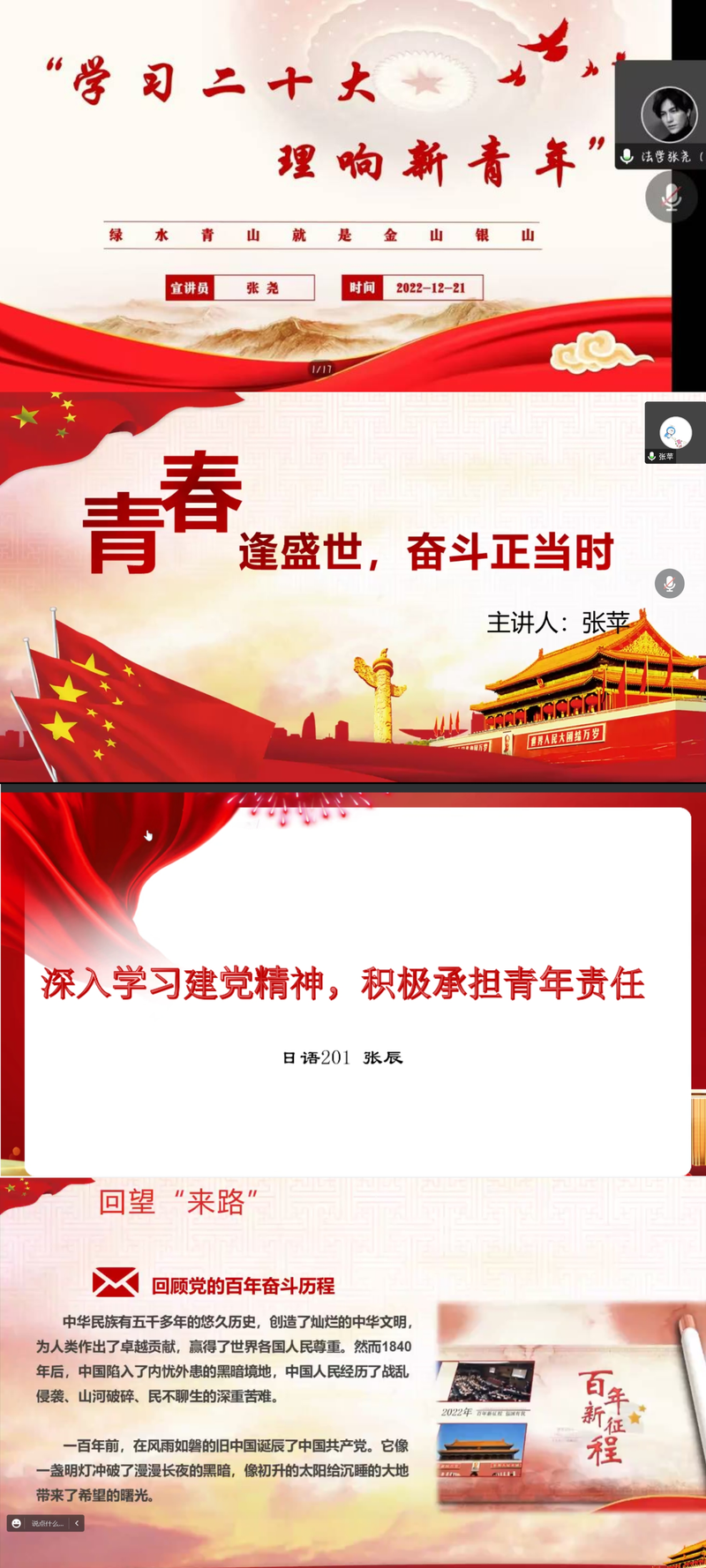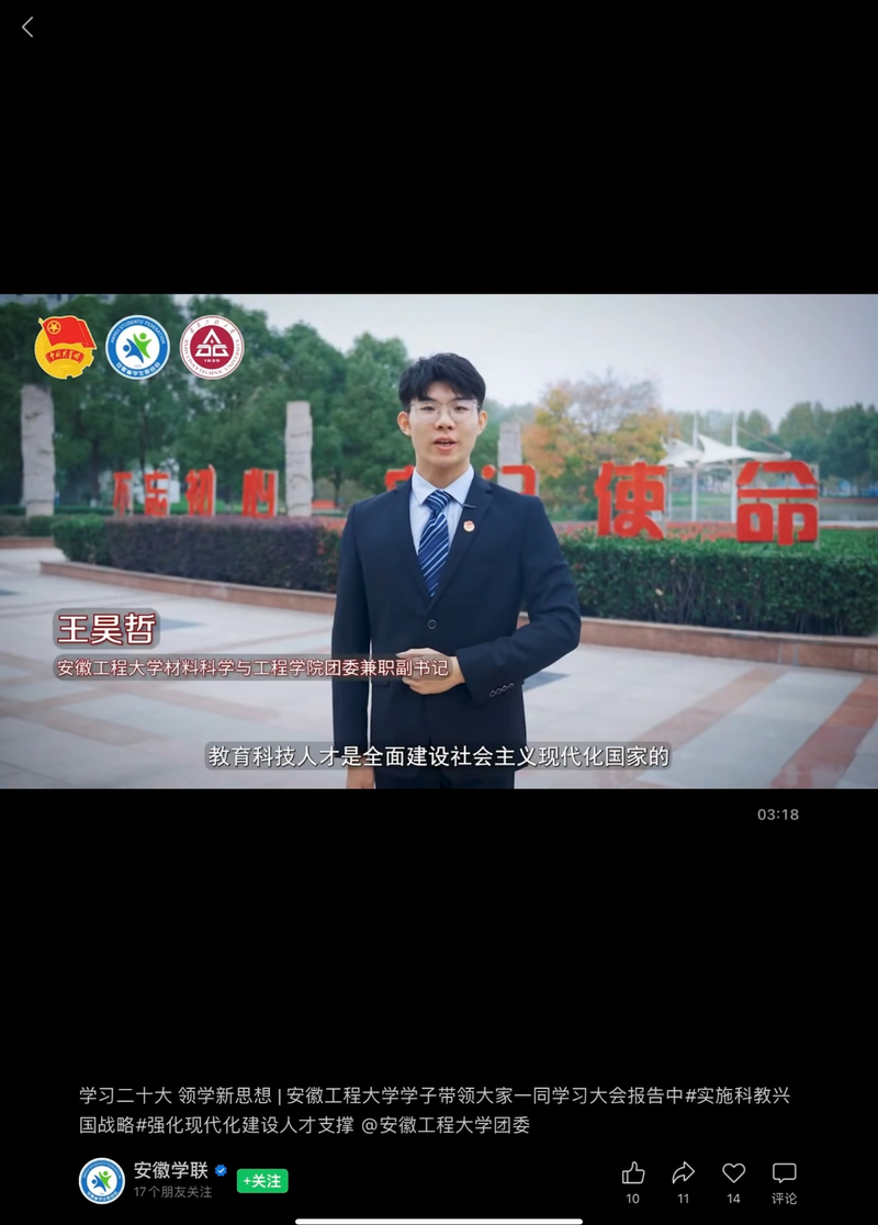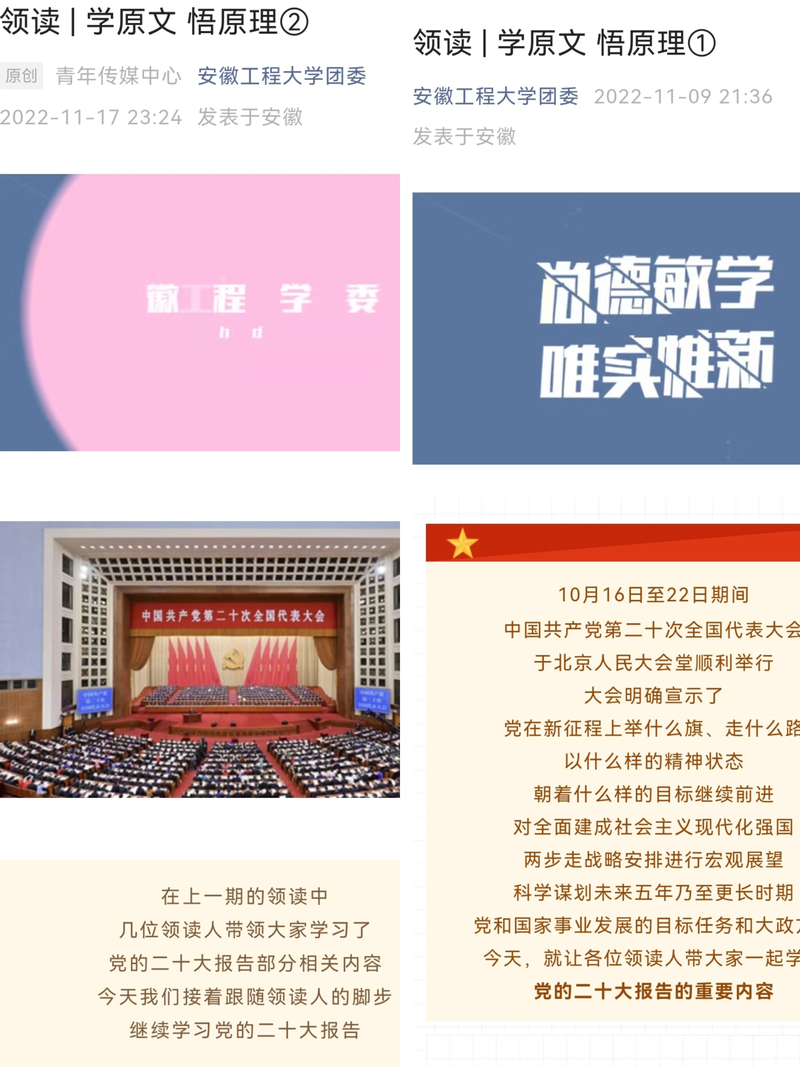 坚持线上领读与线上宣讲相结合,多举措提升学习效率。通过校团委微信公众号推送校领导、职能部门负责人、团组织书记、师生代表领读党的二十大报告音频2期;组织参加“学习二十大、领学新思想”大学生线上学习活动,1个领读视频在“安徽学联”视频号展播。举办“学习二十大 理响新青年”大学生理论宣讲大赛,鼓励学生采用线上线下多种方式宣讲党的二十大精神,截至目前已开展线上宣讲10余场。