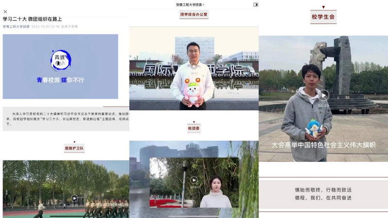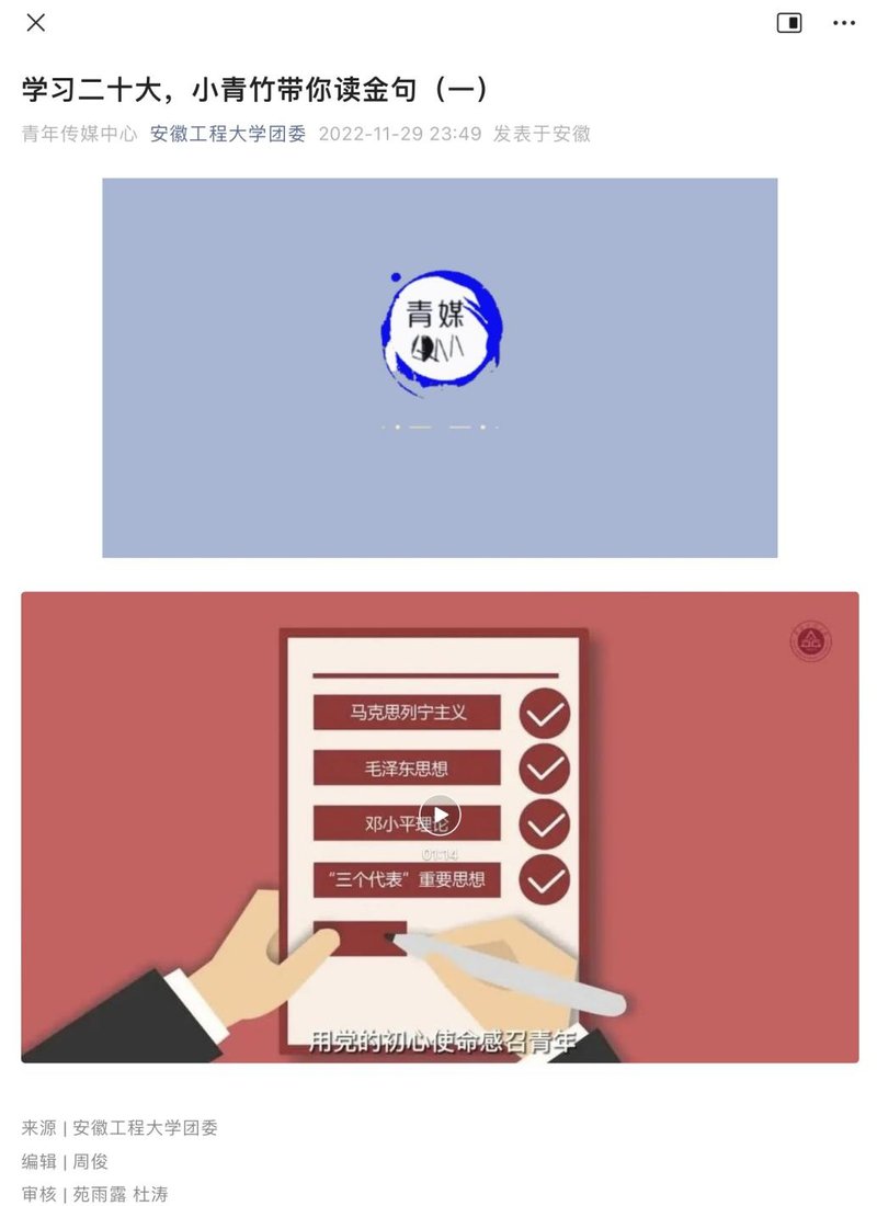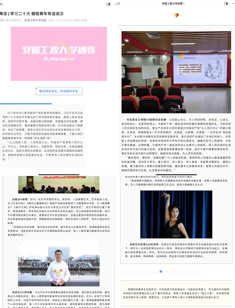 坚持组织带动与骨干引领相结合,多形式促进学习“入心”。校级学生组织坚持先学一步,结合工作职责,推出“学习二十大,微团组织在路上”的新媒体作品,展现学生组织的学习热情。举办“青春心向党,奋斗正当时”微团课视频创作大赛,评选一等奖3名。各级团骨干坚持以学习促思考,结合自身专业和经历,纷纷发表学习感悟,围绕教育、民生等主题在微信公众号推出3期“青谈 | 学习二十大 徽程青年有话说”话题分享。