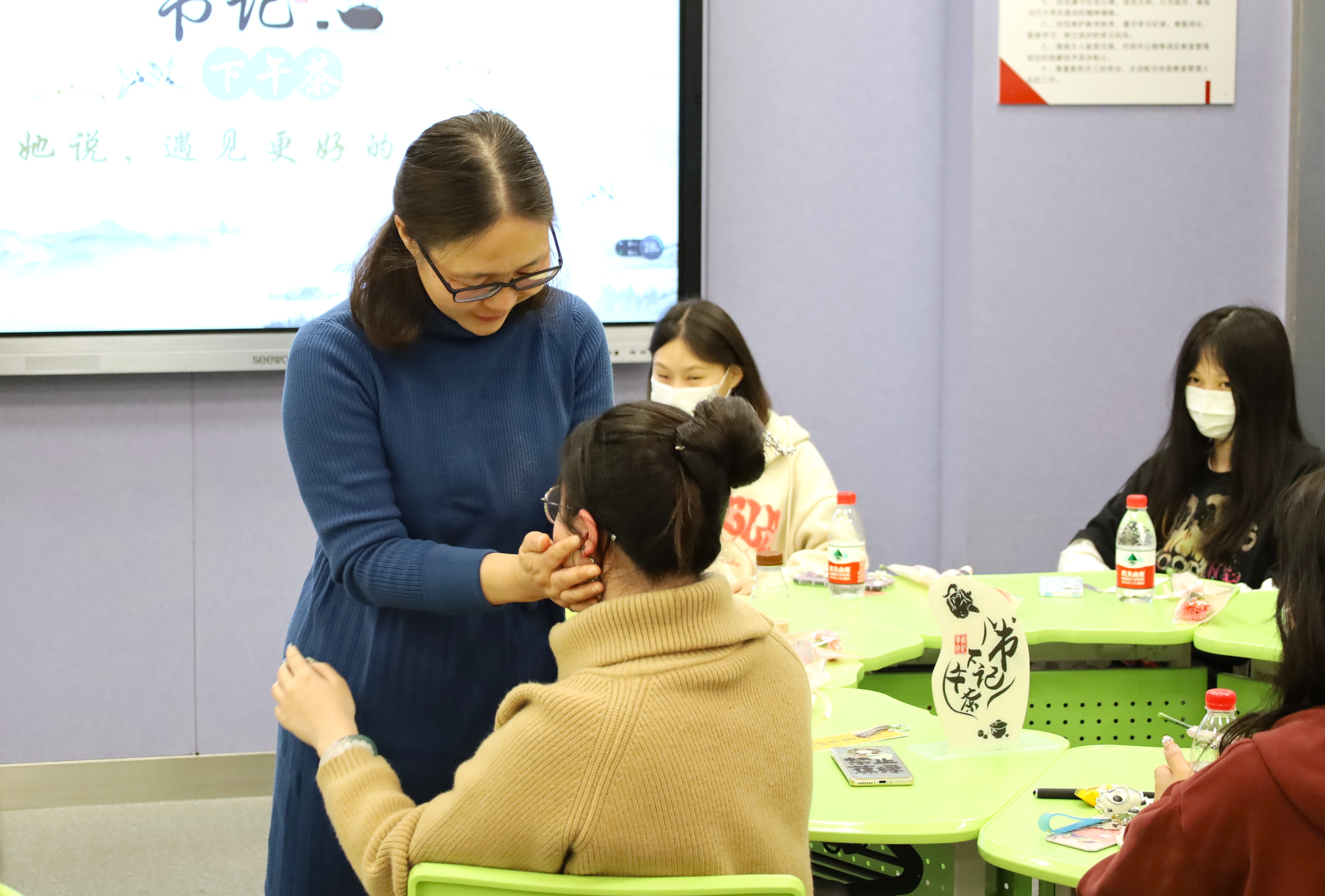 在场嘉宾通过讲述自己的个人经历和阅读的书籍故事,引导同学们从“心”出发,慢慢地设计自己的人生,带着心,带着情,带着爱奔赴未来,做不被他人定义的女性。她们向大家分享《暮色将尽》《斯坦福大学人生设计课》等书籍,希望各位同学在阅读中领悟真理,找到方向。现场师生之间、生生之间相互倾诉,相互治愈开导,形成了轻松、愉悦而相互信任的环境和氛围。工业设计212刘紫阳说:“今天很幸运能够参加本次座谈会,现在社会带给女性的各方面压力确实很大,很需要这样的场合来疏导。很感谢活动方准备的精致茶点、暖心书签和浪漫鲜花,让我感到特别的亲切、温馨、贴心。”