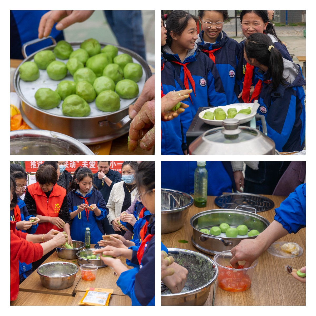 制作花样青团,品尝春天味道。讲解结束后,同学们在工作人员的带领下集体前往志愿服务广场,再在专业人士的指导下开展制作青团活动,清洗食材、调制馅料、放入蒸笼,现场气氛活跃、欢声笑语不断,同学们的“勤”技能在“乐”环境中得到了有效锻炼。