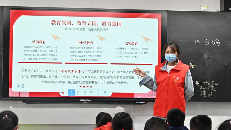 一张张图片展示着我国的科技成就,一次次的互动激发了孩子们对科技的热爱,志愿者与小学生共同学习党的二十大报告中关于科技创新的内容,感受着科技带动发展的重要性。