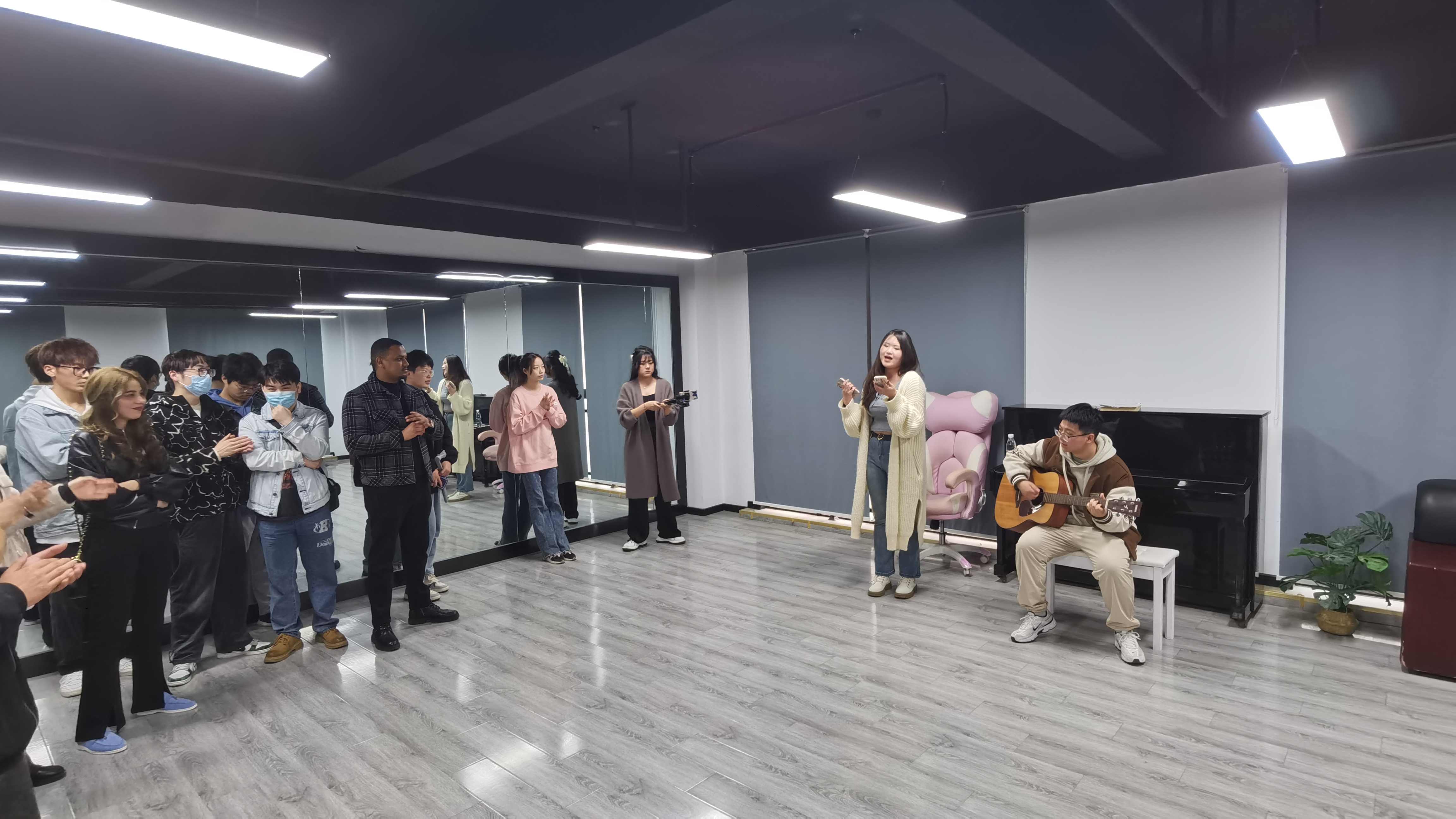 沉浸体验,收获满满。活动最后,同学们还积极展示弹唱才艺,贺宗博同学弹奏吉他,周斐然同学演唱英文歌曲,获得现场阵阵喝彩。此次实践活动得到了同学们的积极响应和热情参与。参加口语交流活动的国贸201班的杜诗韵同学表示,“通过这次的交流,我才明白原来‘哑巴英语’哑在心,不在嘴,大家都会说英语,也都能听懂,只是缺少尝试的勇气,通过这次实践活动提升了我的自信心,未来一定还会参与此类的实践活动。”参加直播活动的材科221的项梦辉表示,“通过身临其境的体验直播,我感受到平时不一样的体验,而在外籍老师的引导下开展业务交流,我感到既有趣也受益匪浅,我觉得英语口语是绝佳的媒介,可以极大地帮助中国企业将物美价廉的商品源源不断的卖到全球,同时也将中国的优秀文化传播到全球。”