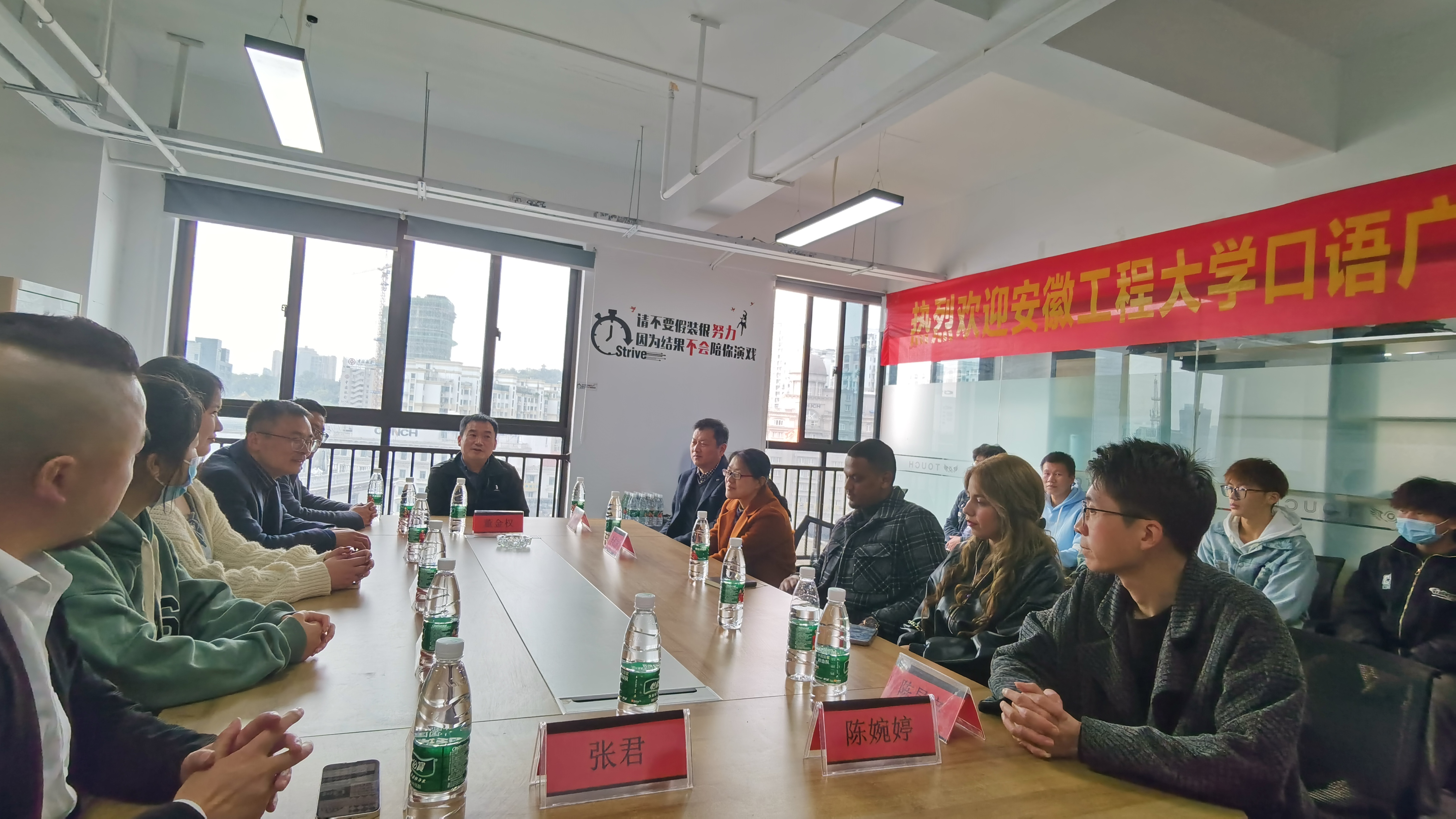 校企一体,共商合作。老师、同学们与企业代表在会议室开展交流。董金权向企业提供这次实践机会表示感谢,介绍了安徽工程大学“用英语讲中国故事”口语广场的创建背景、"思政+口语""口语+专业"的活动主旨以及前期工作。许钢向同学们介绍学校教务处推进大学英语四六级口语考试的积极举措,希望同学们都能主动加强自身英语应用能力的培养。李恒奎表示,学校团委积极推动第二课堂和第一课堂融合,希望口语广场能带来越来越多的具有“青年味”的实践活动,推动学校形成口语学习的良好氛围。陈星宇对师生的到来表示欢迎,并对安徽工程大学开启口语广场深化人才培养改革的做法给予肯定。在谈到公司对于人才的需求时,他强调,“要做好跨境电商直播业务,除了产品的专业知识以外,需要有跨文化交际的能力,因此,英语口语的学习非常必要”。