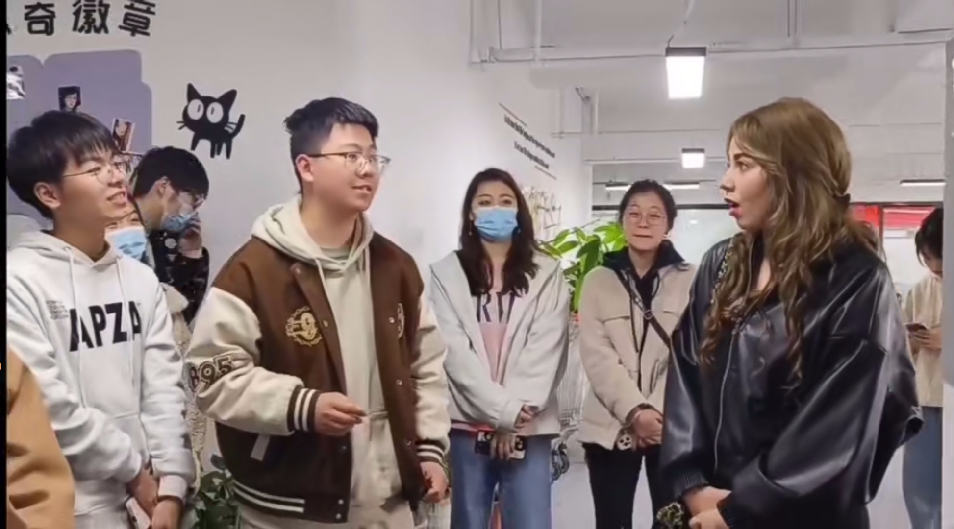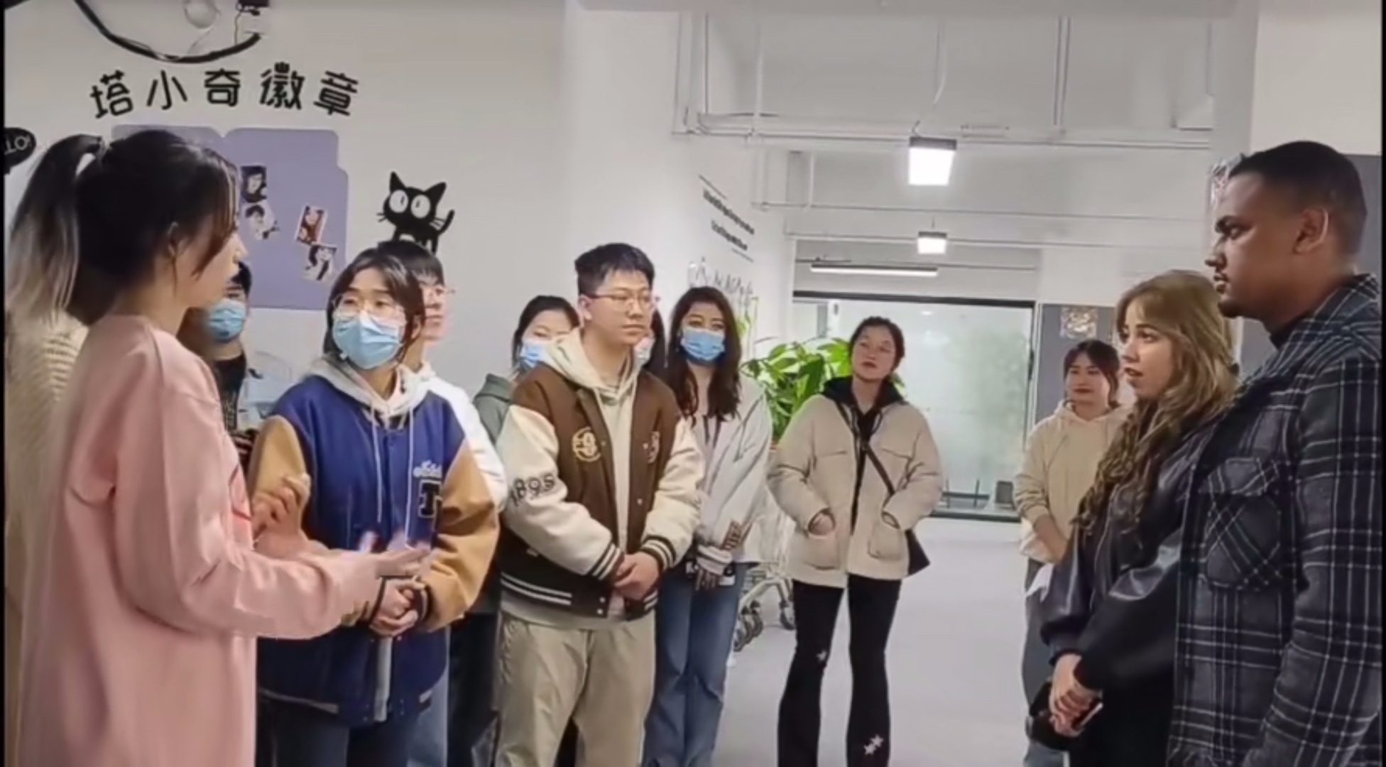 结合业务,口语实践。在公司总经理陈星宇的引导下,同学们走进公司生产线参观学习。外籍工作人员Kida和Emma,与同学们就公司的发展历史、主营业务、生产流程以及招聘要求开展热情友好的交流。他们用英语讲解生产线上工作人员的工作,同学们不时提问互动,现场气氛轻松愉快。Kida和Emma还带领同学们进入公司网络直播间,体验模拟网络直播。Emma亲自示范直播,用纯正的英语讲解直播相关技巧,针对同学们一个又一个互动提问,她都耐心解答。从一进公司时的羞于启齿,到勇敢开口说英语,同学们的积极转变受到Kida和Emma的称赞。