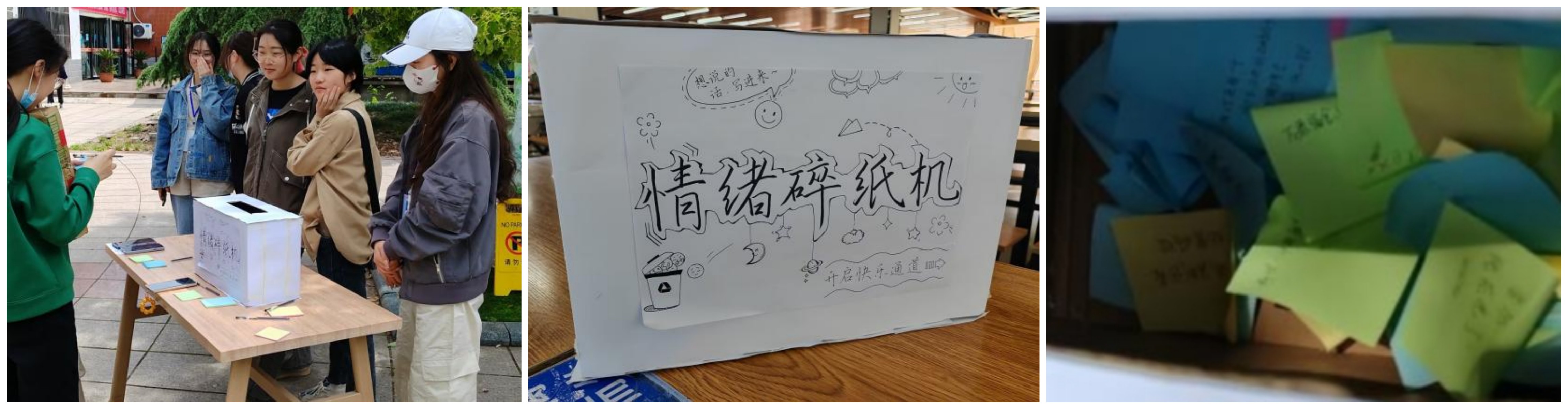 活动开始,经过的同学们慢慢聚集到活动地点,用工作人员准备好的便签和笔写下自己最近的烦恼、焦虑和不开心等情绪的原因,随后投放入情绪碎纸机中。参加活动的同学们通过写下自己的烦恼,投放到工作人员制作的情绪碎纸机中来排解和舒缓自我的情绪,以此鼓励大家积极面对生活中的问题,释放心里的压力,对自己的烦恼说再见。数媒221的张子晗同学说道:“活动以一种合理的方式缓解了我们在生活中的压力和焦虑情绪,既新颖独特,又有着非常积极的意义。”