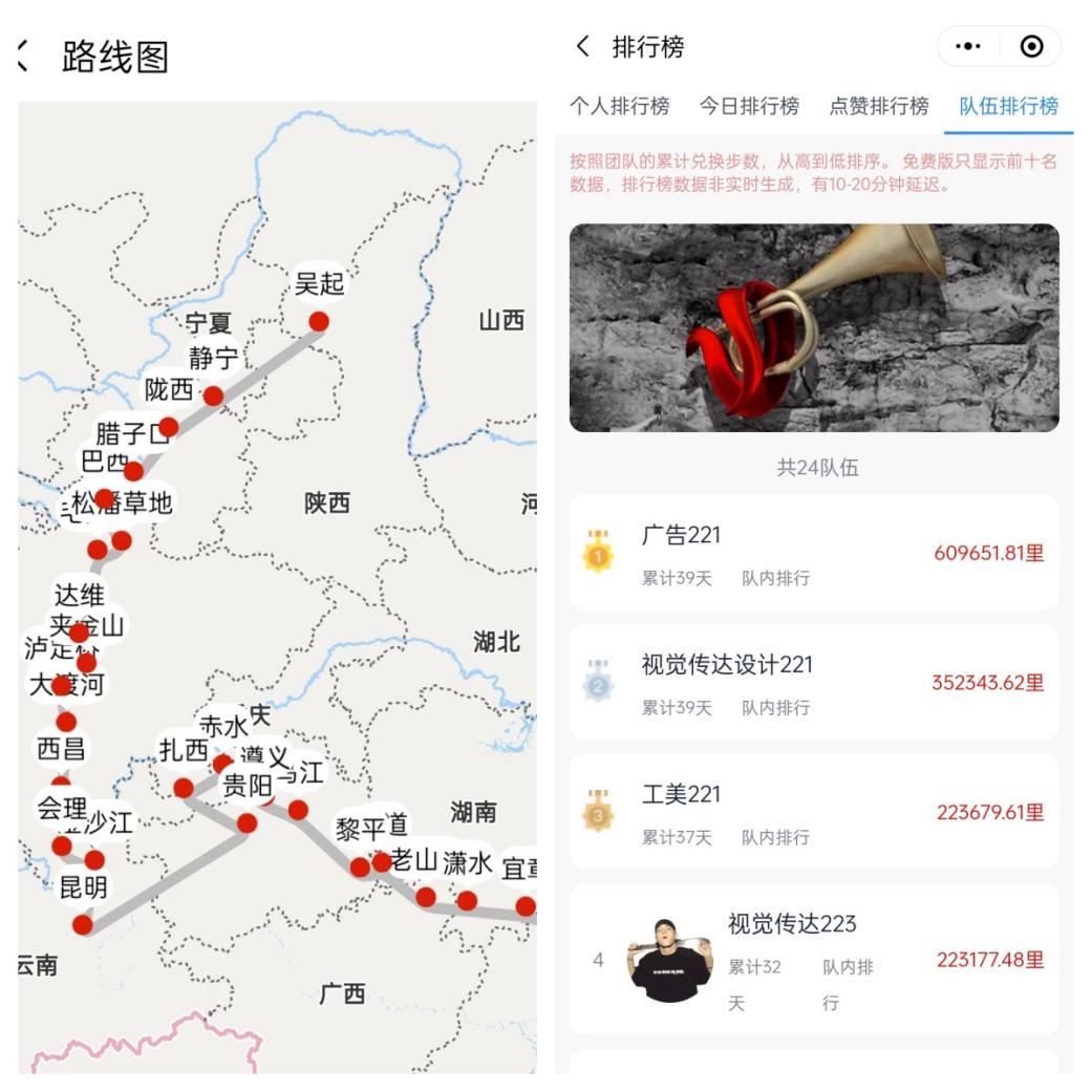 活动覆盖全院学生,以团支部为单位组队参加,采取“线下健步走、线上云长征”的方式,利用“线上云接力”微信小程序,依托“微信运动”计步功能,以“步数换里程”的方式模拟行走二万五千里长征路。线上“长征路”共设置27个站点,按照长征路线顺序,从江西瑞金出发,途经黎平、遵义、赤水、会理、泸定桥、腊子口等地,最后到达甘肃吴起会师。活动还开设了长征历史知识栏目,参赛者每到达一个点,便可解锁该地的历史小知识,了解曾经的烽火岁月,学习长征精神,铭记先烈遗志,提振干事创业精气神。