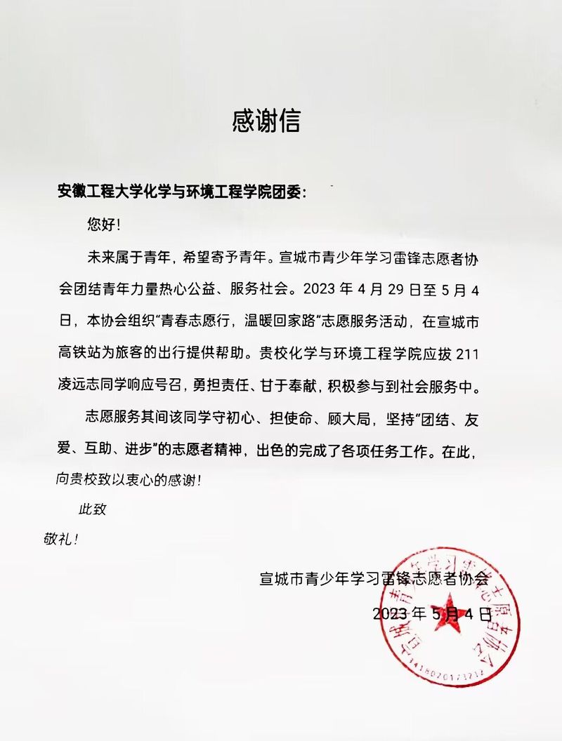 近日,宣城市青少年学习雷锋志愿者协会向我院团委发来感谢信,感谢我院应用化学(拔尖)211班的凌远志同学利用五一假期时间,积极投身志愿服务,参与宣城市“青春志愿行,温暖出行路”志愿服务活动过程中的出色表现。