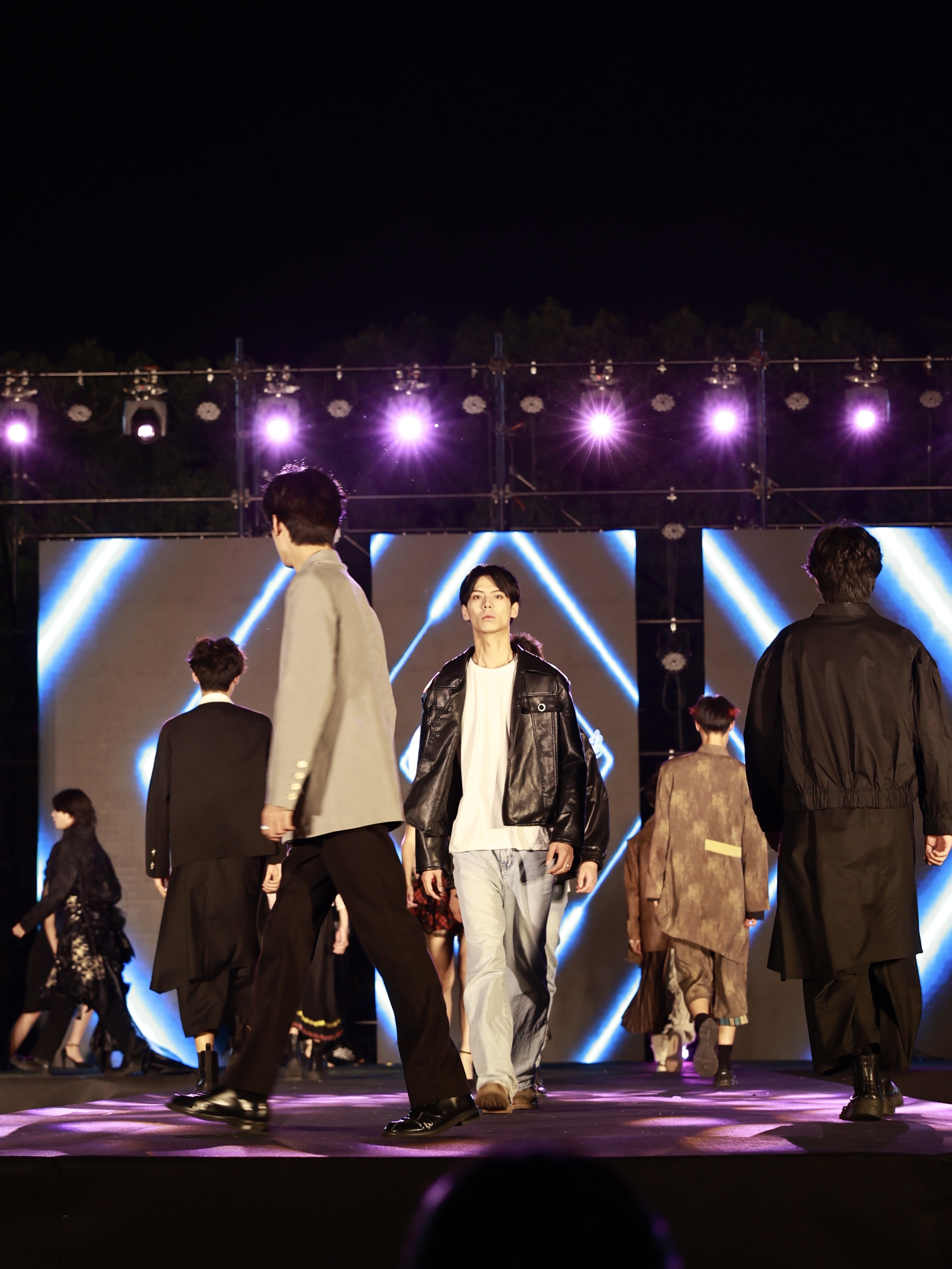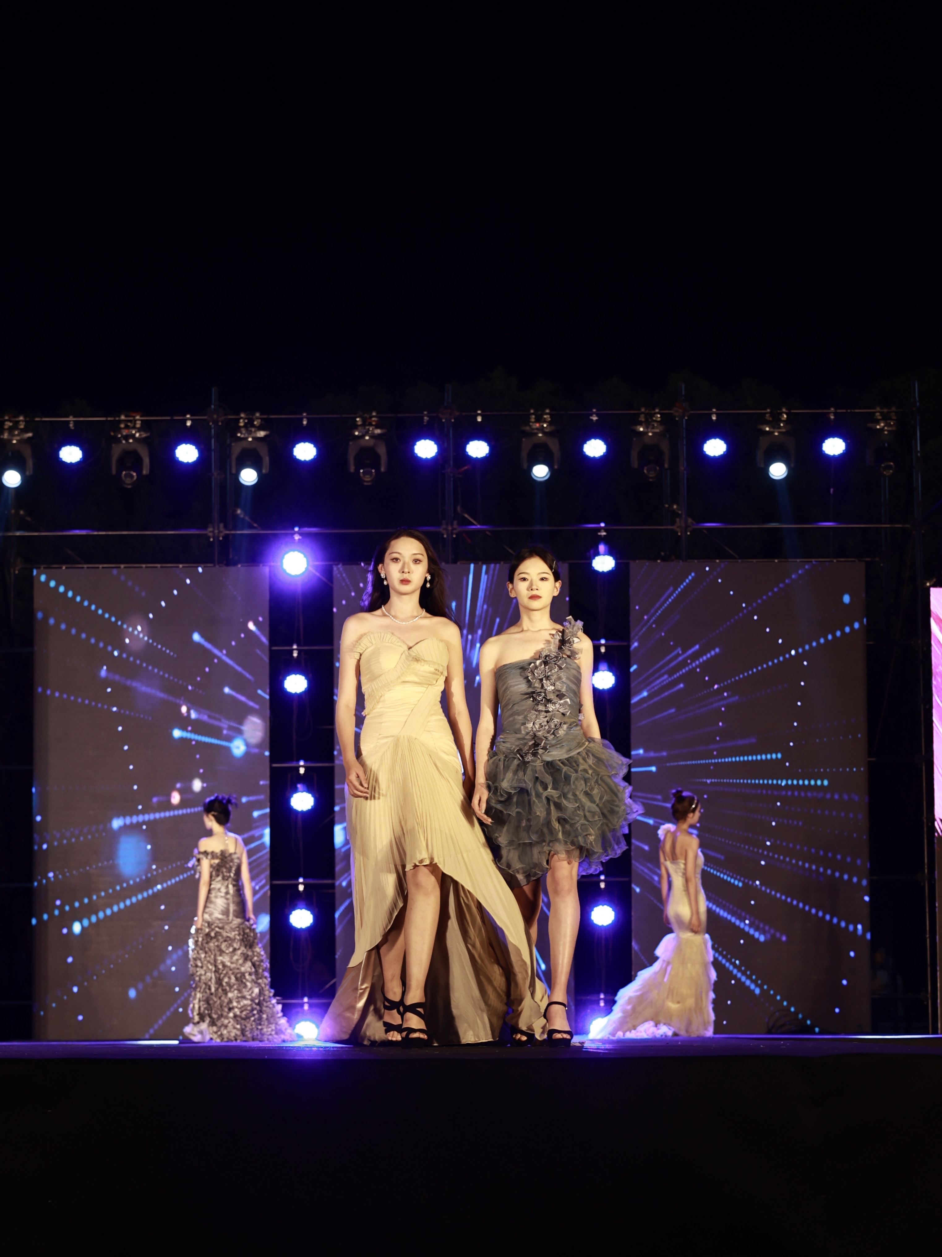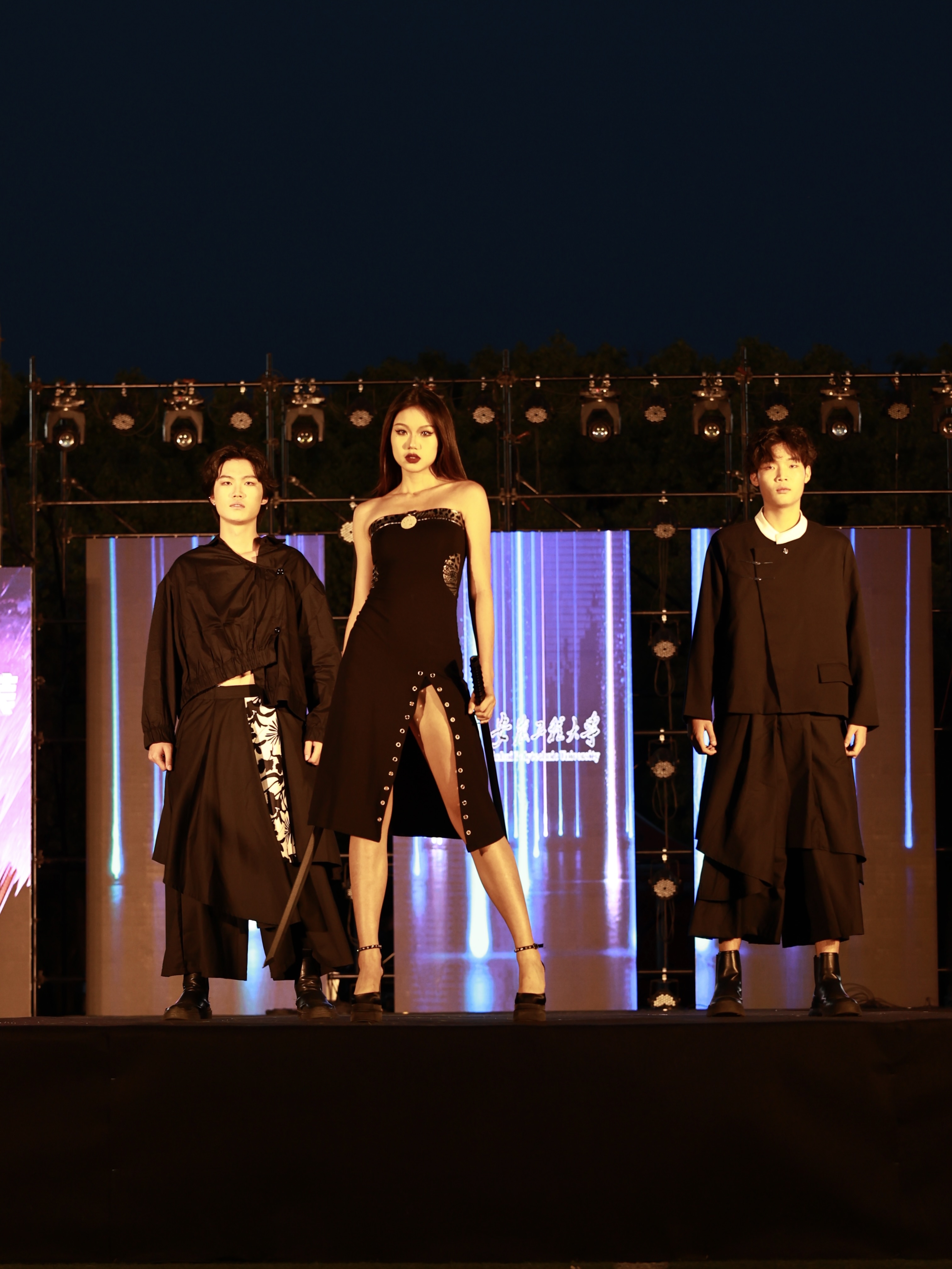 本次时装秀分《黛青茶白》《依衣惜别》《云想衣裳》三个部分,集中展示了3个系列40余套服装。第一部分《黛青茶白》古典优雅的新中式风格直击眼球,服装设计巧妙地融合古典与现代元素,完美体现了多元文化的风采魅力。服装表演专业的学子们发挥专业特长,踩着自信优雅的步伐,赋予服装以生命的演绎,将清婉含蓄的中式美学发挥得淋漓尽致。第二部分《依衣惜别》是服装与服饰设计专业学生的毕业设计,年轻的设计师们用具象服装彰显他们的抽象概念,整体搭配浑然天成,面料选择恰到好处,一针一线中凝聚的是他们付出的心血,饱含的是他们对校园的留恋,一件件精心设计的衣服,宛如美轮美奂的花,模特踏出的每一步,都蕴含着对生命的感悟,对生活的思考。第三部分《云想衣裳》模特们演奏出的是属于青春的狂想曲,他们在光与影的尽头跳跃穿梭,自由搭配出他们的时尚态度。不同颜色的应援棒汇聚成灯海,昭示着同学们不留余力的支持与喜爱。