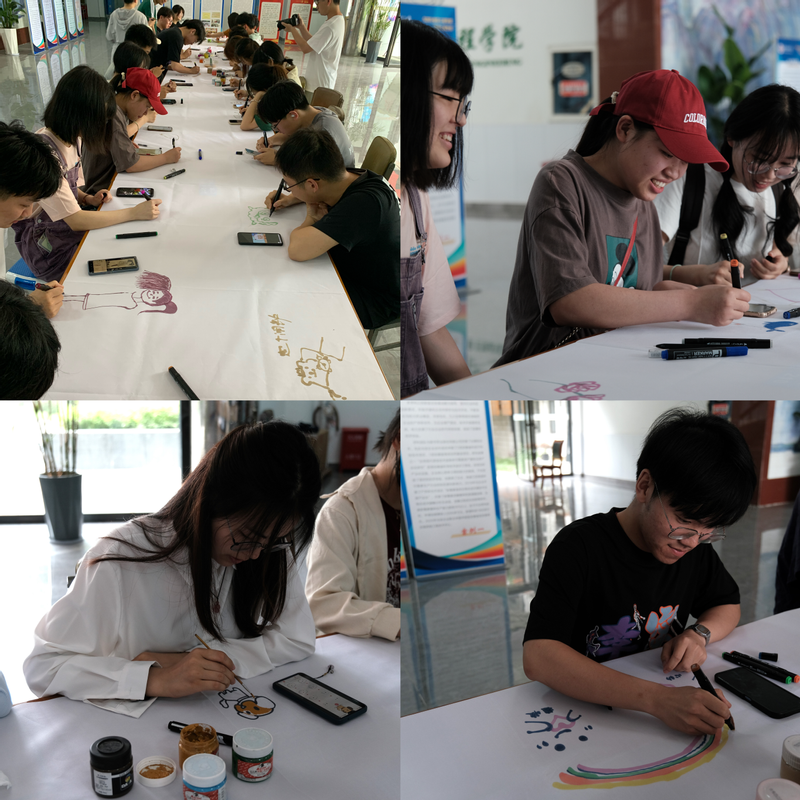 活力涂鸦,绘出心声。5月21日,学院在学院南楼大厅举办了“画出心中美好的样子”心灵涂鸦活动,学院心联络员钟莉娟老师全程指导。活动中,同学们分别以“自己心中最美好的样子”为源,在十米画布上共同作画,并交流彼此的创作灵感和作品内容。钟莉娟对同学们的作品给予了赞赏,并向大家介绍了心理咨询的相关知识,鼓励同学们保持健康积极的生活态度和轻松愉悦的学习心态,充分利用大学时光,不断提升自身综合素质,为自己的大学生涯提交一份满意的答卷。