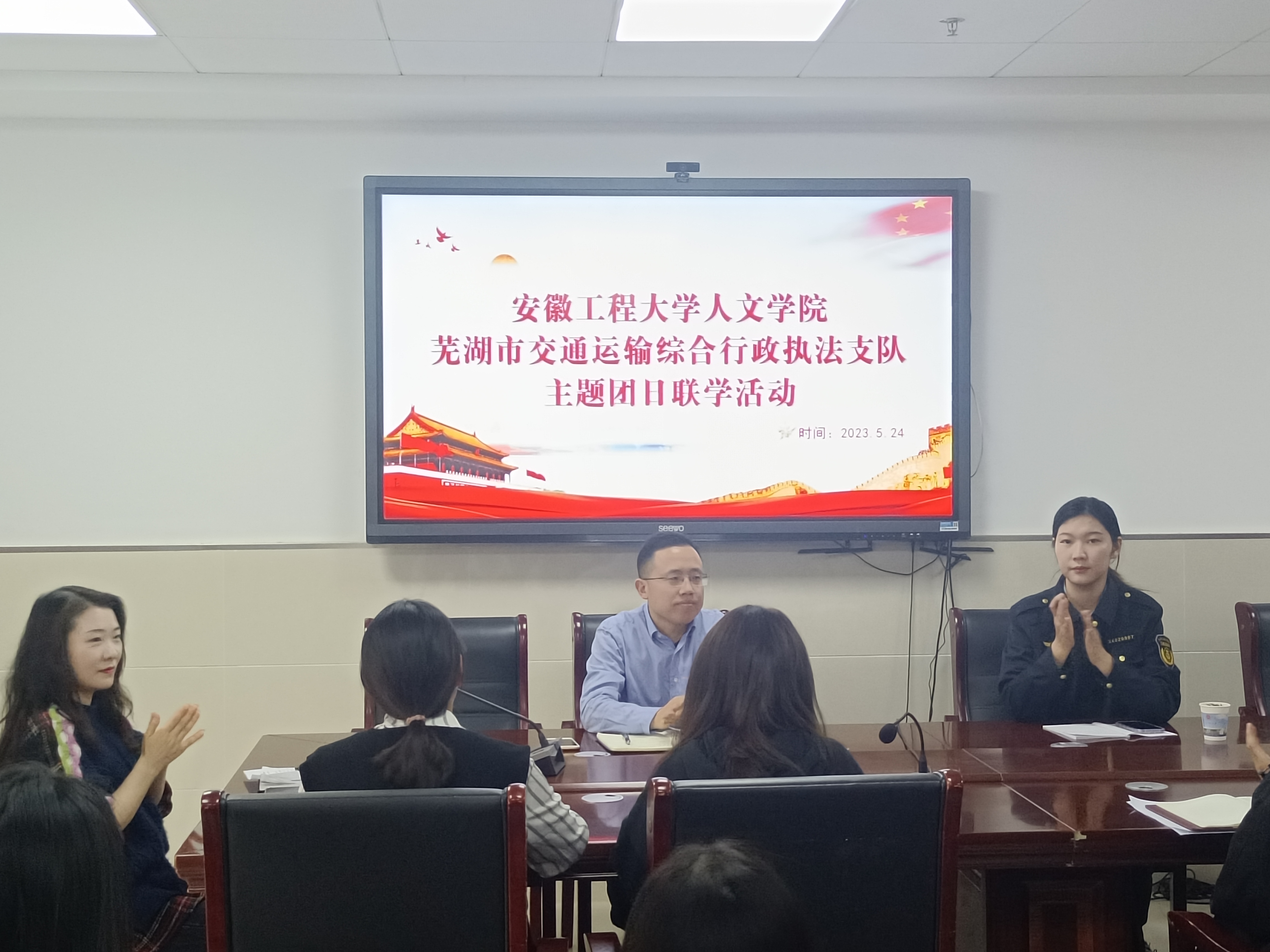 为深入开展学习贯彻习近平新时代中国特色社会主义思想主题教育,宣传贯彻党的二十大精神,引导团员青年补足精神之“钙”、铸牢思想之“魂”,进一步增强团员青年的责任感和使命感,5月24日下午,安徽工程大学人文学院和芜湖市交通运输综合行政执法支队在图书馆1307会议室开展“感悟思想伟力,凝聚奋进力量”主题团日联学共建活动。学院党委副书记王中江、市交通局综合行政执法支队团总支书记郑榕晟、“青领计划”学生代表、各团支部学生代表参加了本次活动。活动由学院团委副书记利昕云主持。