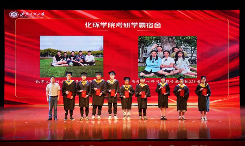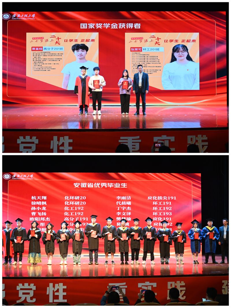 化环学院党委书记章兵、副院长张伟为国家奖学金和安徽省优秀毕业生获得者颁发证书。王燕、李恒奎为获得化环学院优秀大学生同学颁奖。