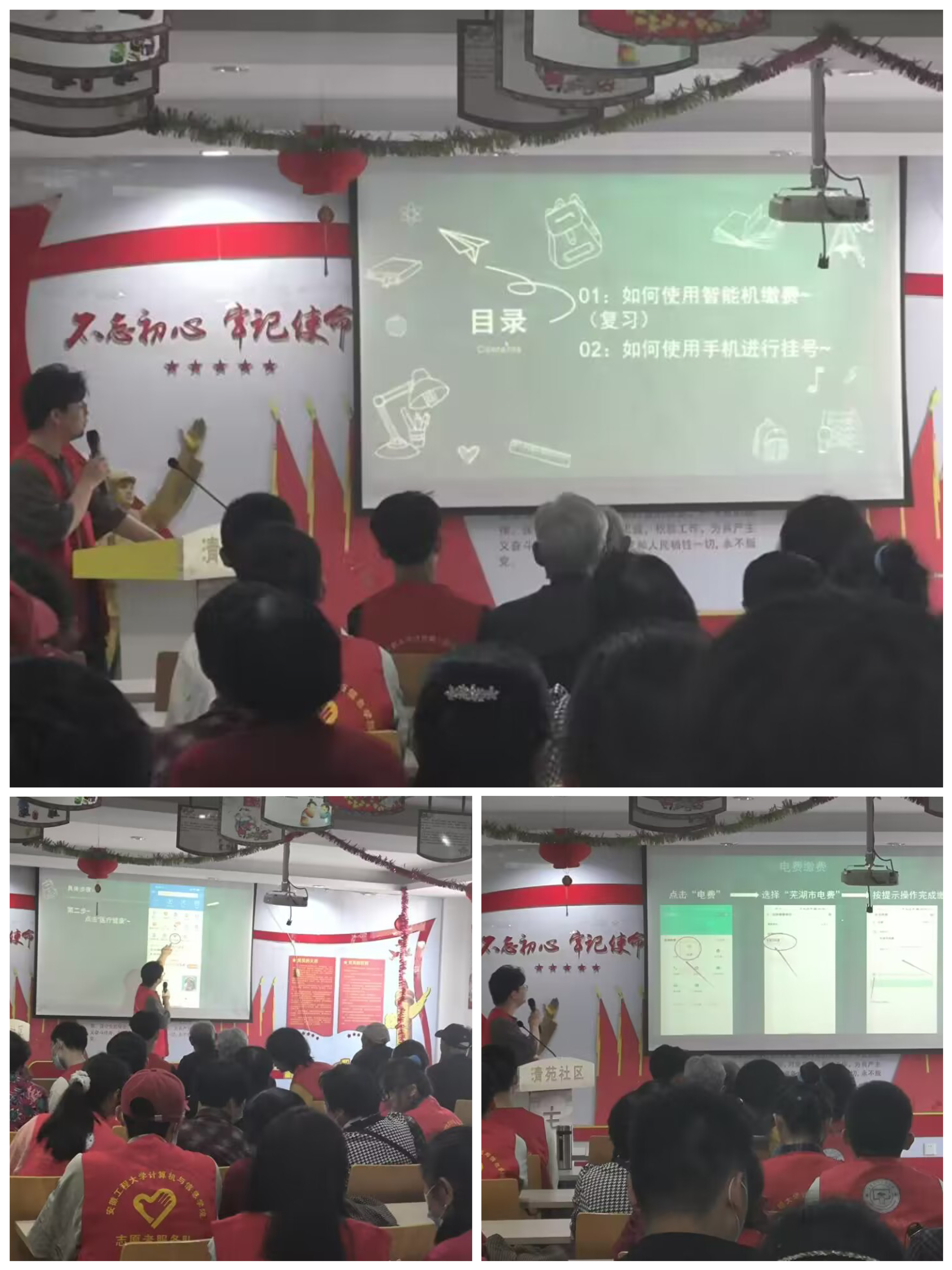 为帮助老年人了解使用智能手机预约挂号、买药,缴纳水电费等操作方法,“杜鹃花”志愿服务团队走进芜湖市鸠江区清苑社区,面向社区的老年人开展普及智能手机预约挂号和实现网上生活缴费志愿服务活动。