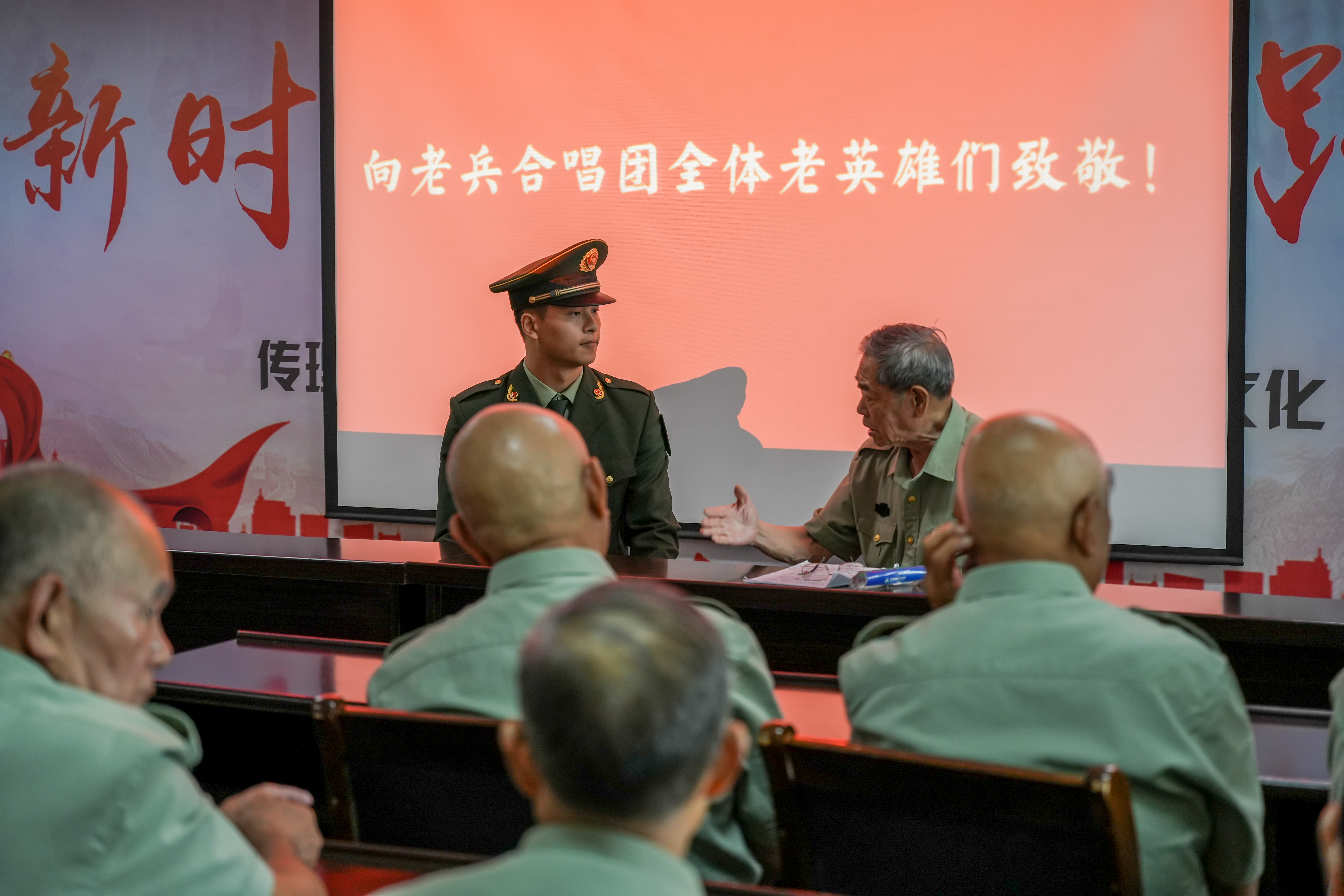 在“党建带团建”环节,李巷社区的老兵们为团队成员分享了一场生动的党课。宋志坤爷爷是一名参加过抗日战争和解放战争的老战士,他结合身边人、身边事,讲述了革命战争的那段艰苦岁月,展现了老兵的家国情怀和军人本色。他说:“我们这一辈子都是党的儿女,我们要听党话、跟党走,我们要把我们的经验和教训传给年轻人,让他们知道我们是怎么打下这个江山的。