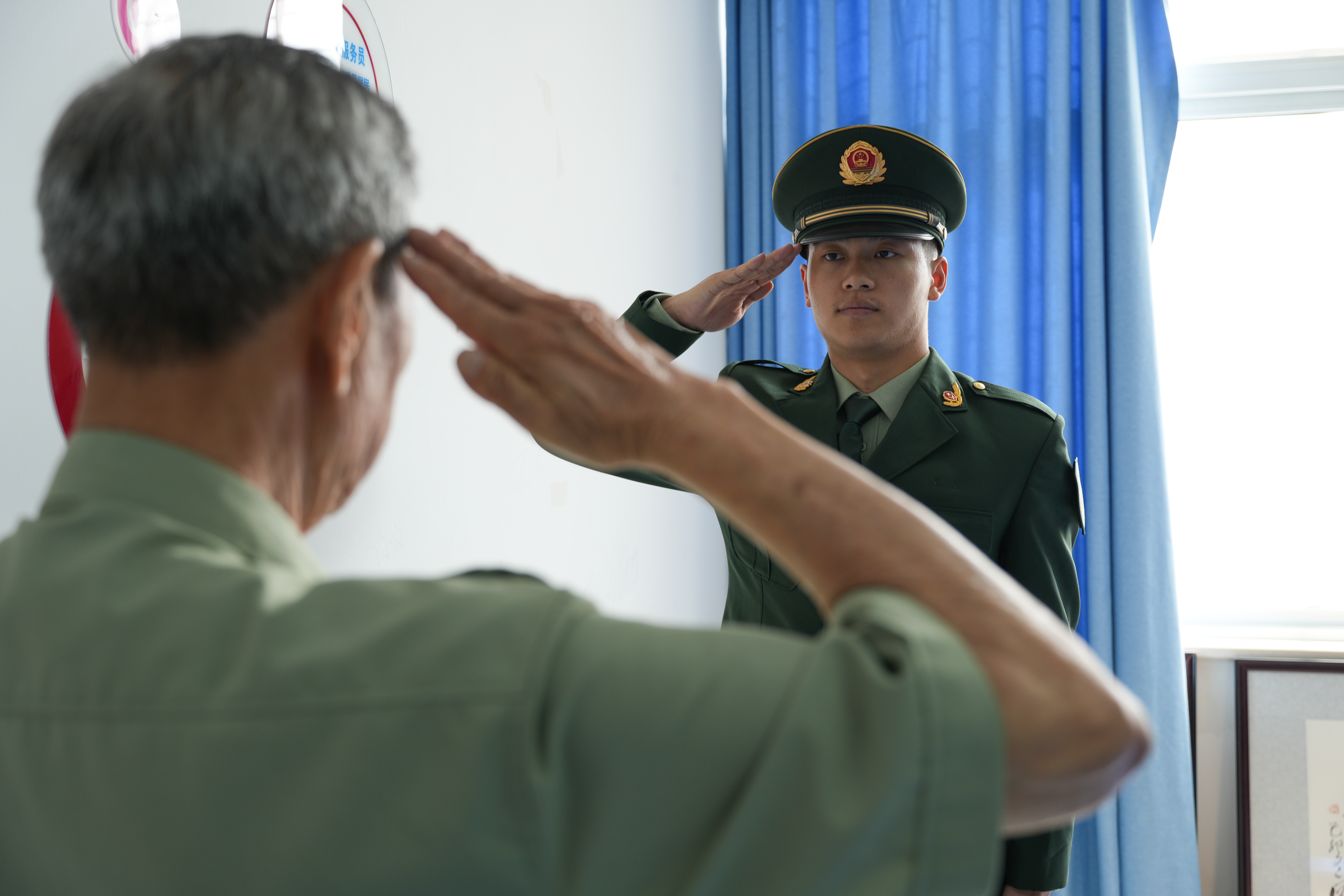 在“两代军人的对话”环节,人文学院法学212班退役大学生贺行郑同学采访了抗美援朝的赵洪庚老兵。贺行郑同学曾服役于解放军某部,两年的军旅生涯,意志品质和专业技能都得到了锻炼。他向赵洪庚老兵报告了在军旅生涯中的收获与成长,赵老对他的成绩表示赞赏,并分享了自己军功章、奖章背后的故事。