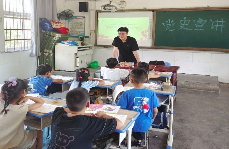 潘店小学共6个年级,师生不足100人。在宣讲开始前,团队成员先向小朋友们进行了党史提问,发现大多数孩子只知道“毛爷爷”和“周总理”,而对其他的革命先烈不大了解。我们通过PPT向孩子们介绍了一些党员事迹。看得出孩子们虽然听得一知半解但是一直在积极应和成员们的宣讲内容,时不时举手发言。随后团队成员为大家播放了红色电影,让小学生们可以更加深刻感悟那段岁月。在科普党史知识时,因为面向的是小学生,有些太深奥的话题和相关理论向他们解释起来有一点难度,团队成员就重避轻地用他们可以理解的方式进行宣讲。