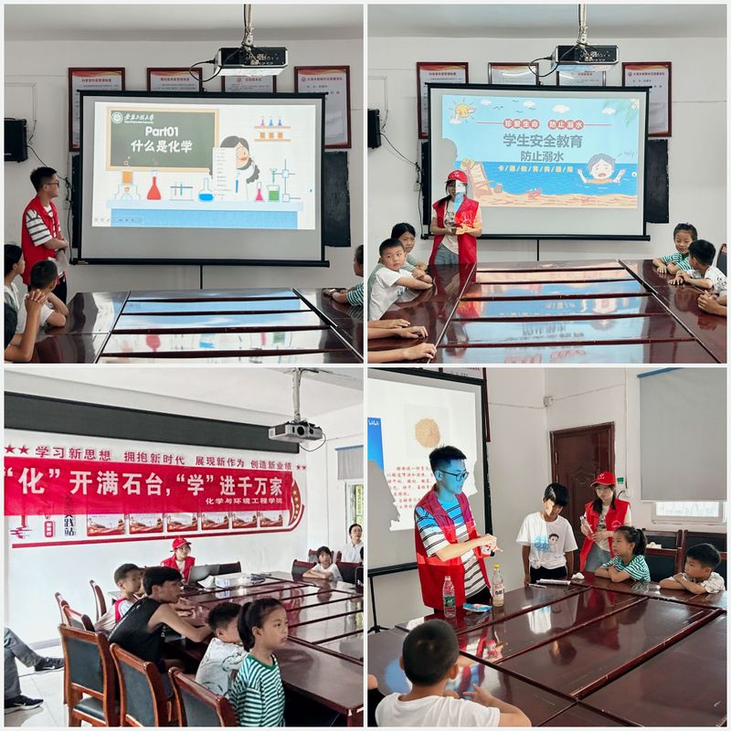 为深入学习宣传贯彻习近平新时代中国特色社会主义思想,全面落实党的二十大精神,进一步提高农村儿童科学文化素质,将科普知识送进乡村,助力乡村振兴战略实施,7月6日至7月8日化学与环境工程学院“魔法化学社会实践队”在池州市石台县大演乡新联村开展主题为“化”开满石台,“学”进千万家,科普知识进乡村社会实践活动。