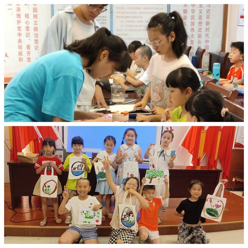 感悟传统之美,展现创意之风,一堂别出心裁的绘画粘土课就此展开。志愿队以带领小朋友欣赏传统文化的混剪视频为基点,深入浅出的为其讲解了中国优秀传统文化的由来和发展。用丙烯绘多彩温柔江南水乡,描摹“夏至”荷花之美;用粘土塑“端午”游湖之情,雕“中秋”花好月圆,拼接点缀“大暑”的趣味风光和“蜻蜓立上头”。小朋友在志愿者的引导下打好线稿,共同上色、捏粘土、打磨作品,在创作中体会中华优秀传统文化中中式建筑、节气和风俗节日的蕴意。
