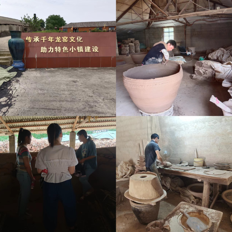7月10日至11日,团队到达宁国港口千年龙窑基地。在讲解员的带领和介绍下,团队成员了解到龙窑的组成、工艺流程、客户分布,并观摩窑器的制作过程。在匠人制窑的“捶打”过程中,讲解员提到“泥龙盘柱法”,这是一种古老的纯手工制作陶器的技艺,用粗细均匀的泥条做出各种形状的作品,技术难度大且只能由人工制作,如何传承、怎样传承成为该项技艺的发展难点。接着,团队到达基地内的工厂观摩胚体制作过程。厂内的温度非常高,通过匠人的介绍,团队成员了解到,这些半成品因为需要晾干,所以在炎热的天气只能靠风扇散热。高温酷暑下,匠人们依旧坚守传统、精益求精,让团队成员不禁感叹与敬佩。