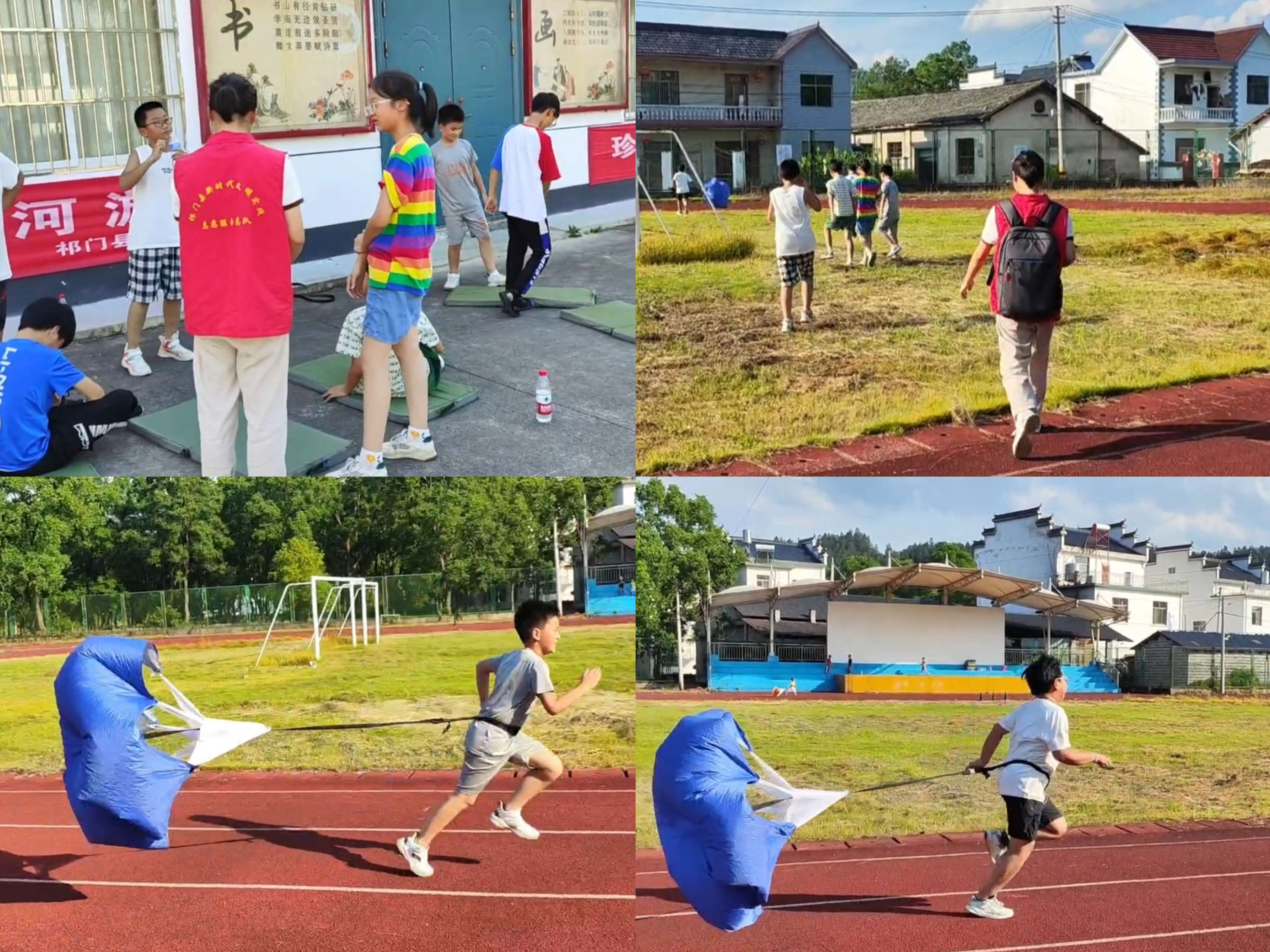 走进操场指导体育锻炼。为了更好丰富实践内涵,团队邀请了专业的体育生指导初中生和小学生们开展活动,并购买赠送阻力伞帮助提升青少年学生体育运动训练效果。青年志愿者们向同学们展示了正确的热身流程,包括拉伸、动态准备和心肺功能训练。通过这些热身动作,志愿者们引导同学们有效准备身体,预防运动损伤。此外,他们特别强调长期“躲”在空调房不是应对炎热夏季的万全之策,鼓励同学们合理安排运动时间,在适当时候外出运动,及时排汗,提高身体机能。这不仅有助于保持身体健康,还能增强抵抗力和适应力。通过活动开展,不仅让学生们感受到了健康运动的乐趣,还有效促进了青少年学生身心健康发展。