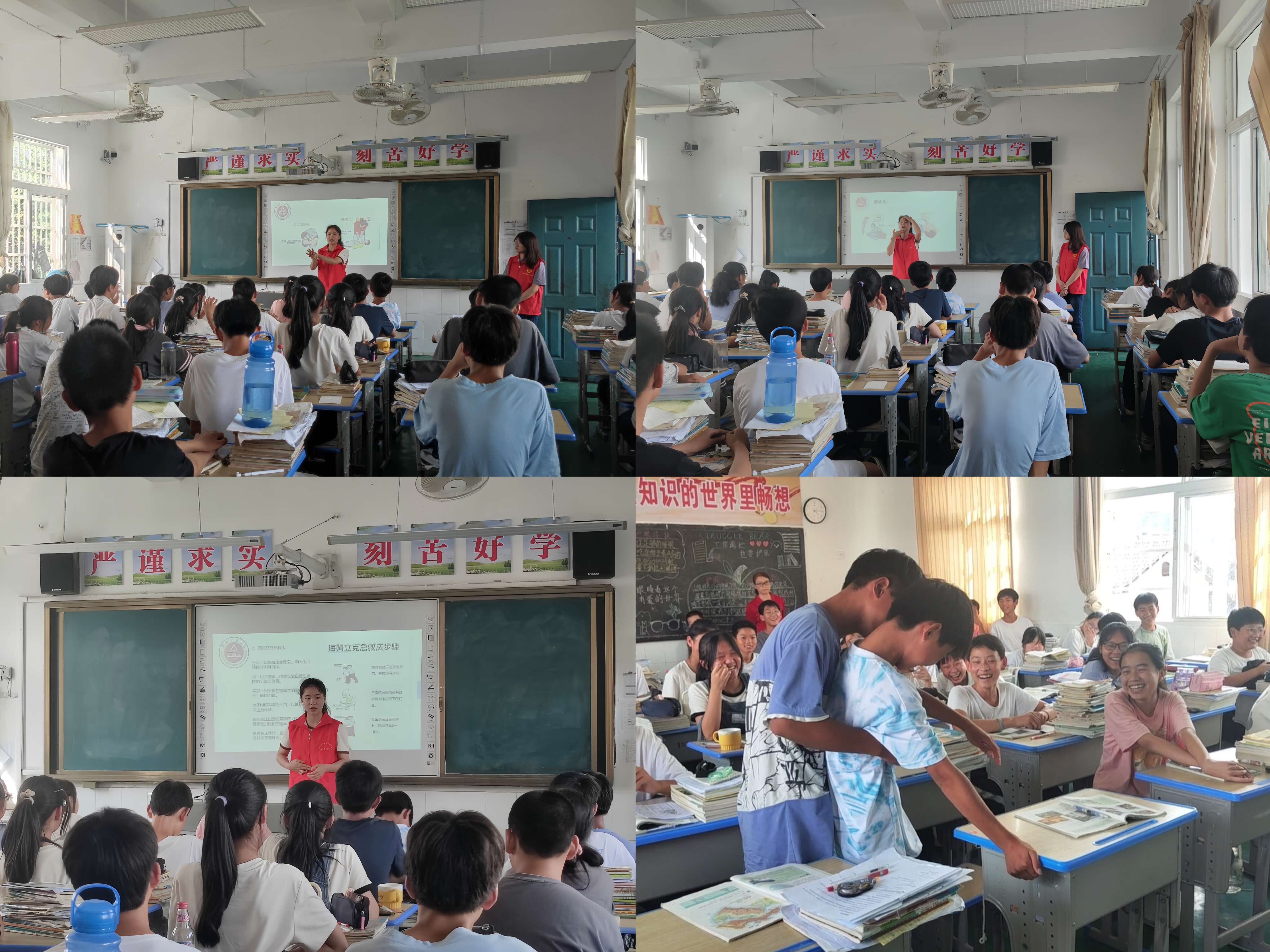 走进课堂科普健康知识。经前期调研得知,凫峰中学的体育设施较完备,学生课余活动丰富。同时,也因正值酷暑,经实践队与学校老师沟通交流,走进课堂进行宣讲的课程内容主要包括介绍如何健康运动、宣传防溺水、科普海姆立克法等急救知识。课堂上,同学们积极参与讨论,与成员们沟通交流关于健康运动方面的问题。志愿者们也强调,身体健康是一切的基础,有良好的体魄才能更好地在生活学习方面发挥潜能。在科普海姆立克急救法时,有两位男生毛遂自荐上台演示,同学们都聚精会神地学习领会。在这样轻松又愉快的氛围下,同学们迅速而又正确地掌握了相关急救法。在双方的默契配合下,一堂普通的宣讲课焕发出别样活力。
