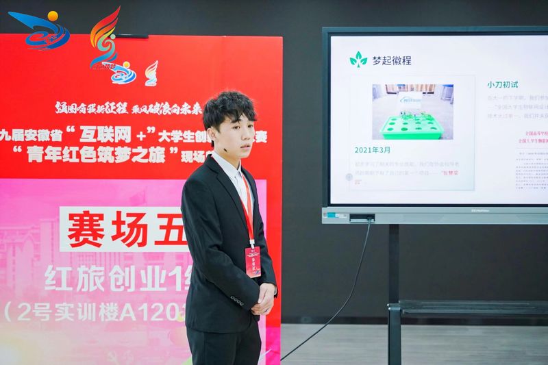 本次大赛的校赛于四月份启动。校团委结合假日思政主题教育、课外学术科技作品竞赛等活动,组织动员大学生结合专业、特长参与比赛。比赛共收到近500份作品,参与人数3000余人。六月份校团委组织专家对校赛进行评审,共评选出一等奖62项、二等奖93项、三等奖125项,并遴选7项推荐至省赛。经省赛专家网评,我校红旅创业组2项作品进入现场总决赛。《桃之夭夭,葡葡丰成—5G智慧果园的领跑者》作品以其立意新颖、汇报精彩而脱颖而出,荣获安徽省红旅创业组金奖,《“链”来振兴—用前沿技术赋能农产品产供销一体化》作品荣获安徽省红旅创业组银奖。