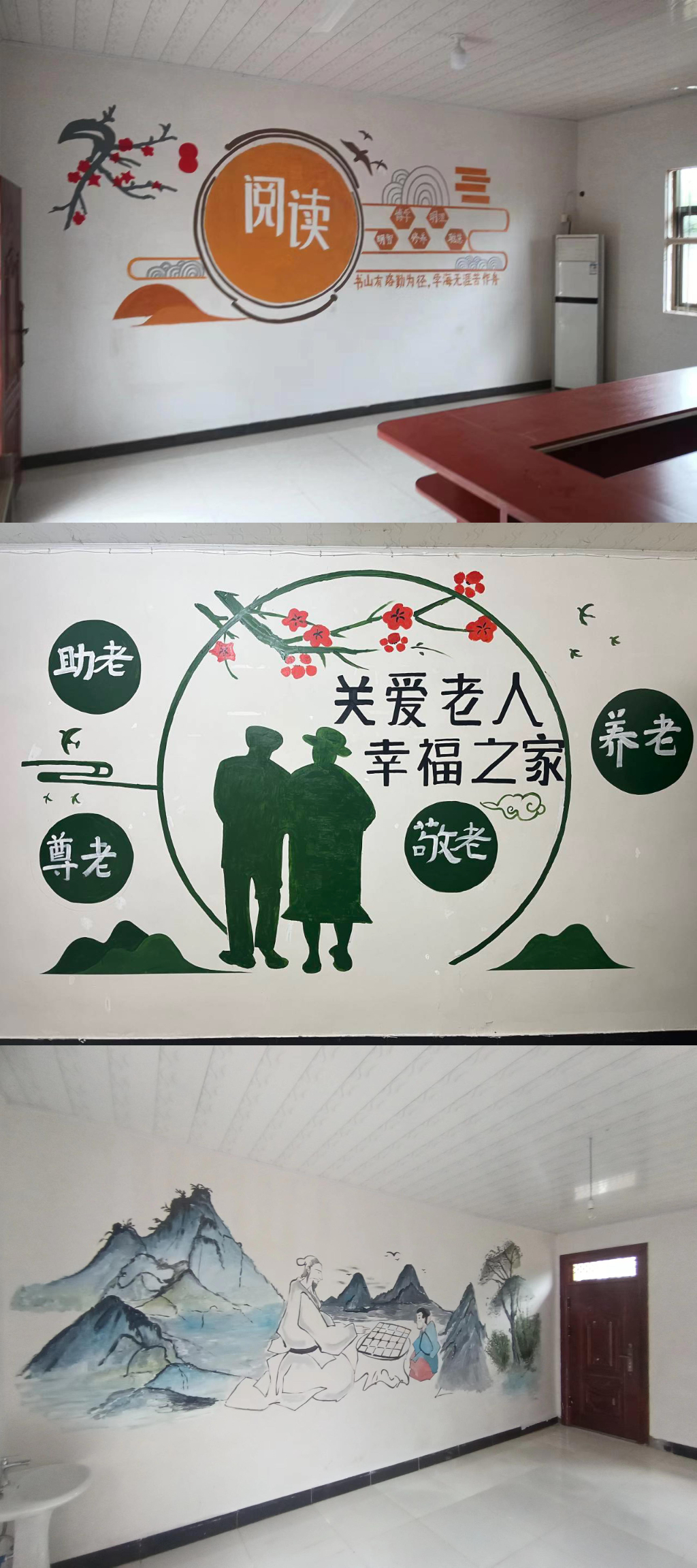 团队负责人提前联系村委会沟设计通方案,根据村部阅览室、棋牌室、休闲室和多功能室四个房间不同主题确定效果图。团队成员顶着酷暑高温在炎炎烈日下,从构图起形到勾勒线条,从调色再到上色,他们齐心协力、分工合作、各司其职。经过队员们细致的涂绘,单调的白墙变得立体丰富、雅韵翩然,一面面构思巧妙、通俗易懂的墙绘悄然扮靓了文思孙村民活动室,成为乡村振兴、美化村庄环境亮丽的风景线,吸引了很多村民驻足观看。村民们忍不住惊叹到:“你们这些学生真是厉害,一天时间就完成村部大改造,我们在这样的房间里看书下棋心情都变好了!真的是很亮眼!”团队成员齐人杰同学说到:“这次艺术墙绘活动我收获很多。非常荣幸可以将自己所学的专业技能服务到城乡规划建设和人民高品质生活需求中,也很开心能够为助力美丽乡村建设做出我们新时代大学生的一份贡献。”