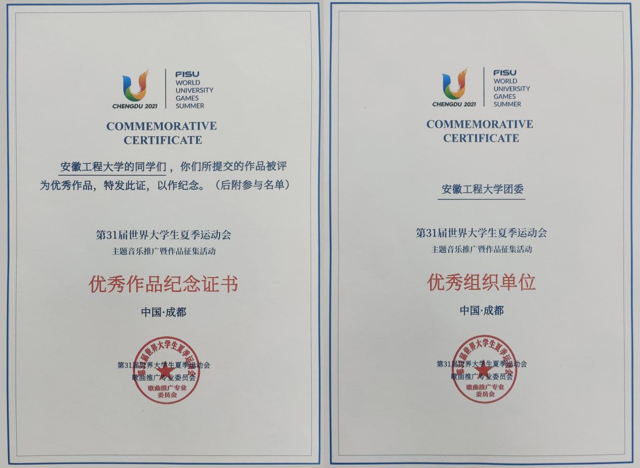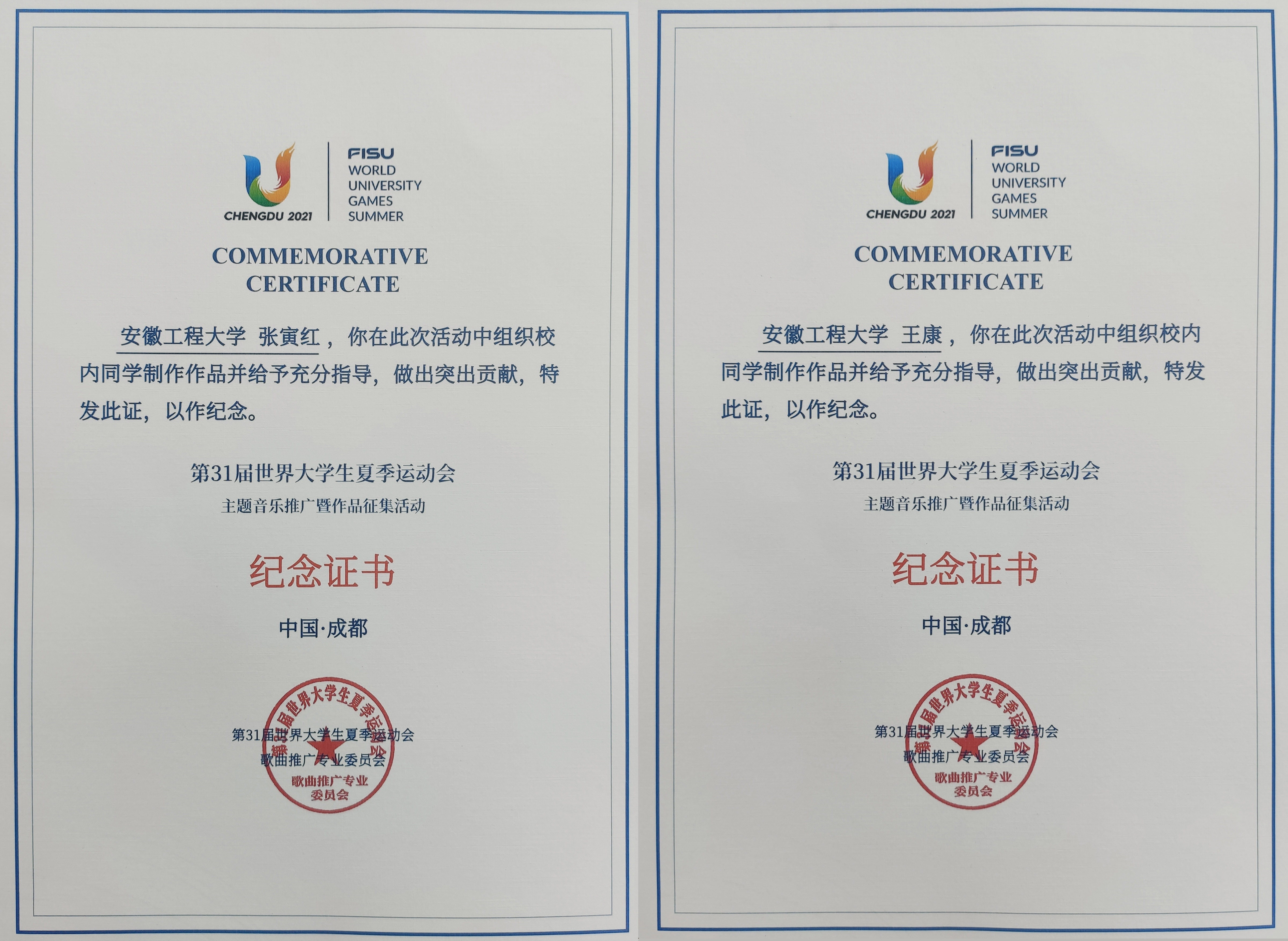 为更好地展现大运会精神,传播大运会歌曲,“以声传声,听见大运”,第31届世界大学生夏季运动会组委会面向全国高校开展大运会主题音乐推广征集活动,我校成功入选主题推广曲目《爱是一样的》全球同唱活动参演名单,提交的原创作品被评为优秀作品,并获评优秀组织单位。张寅红、王康获评优秀指导教师。