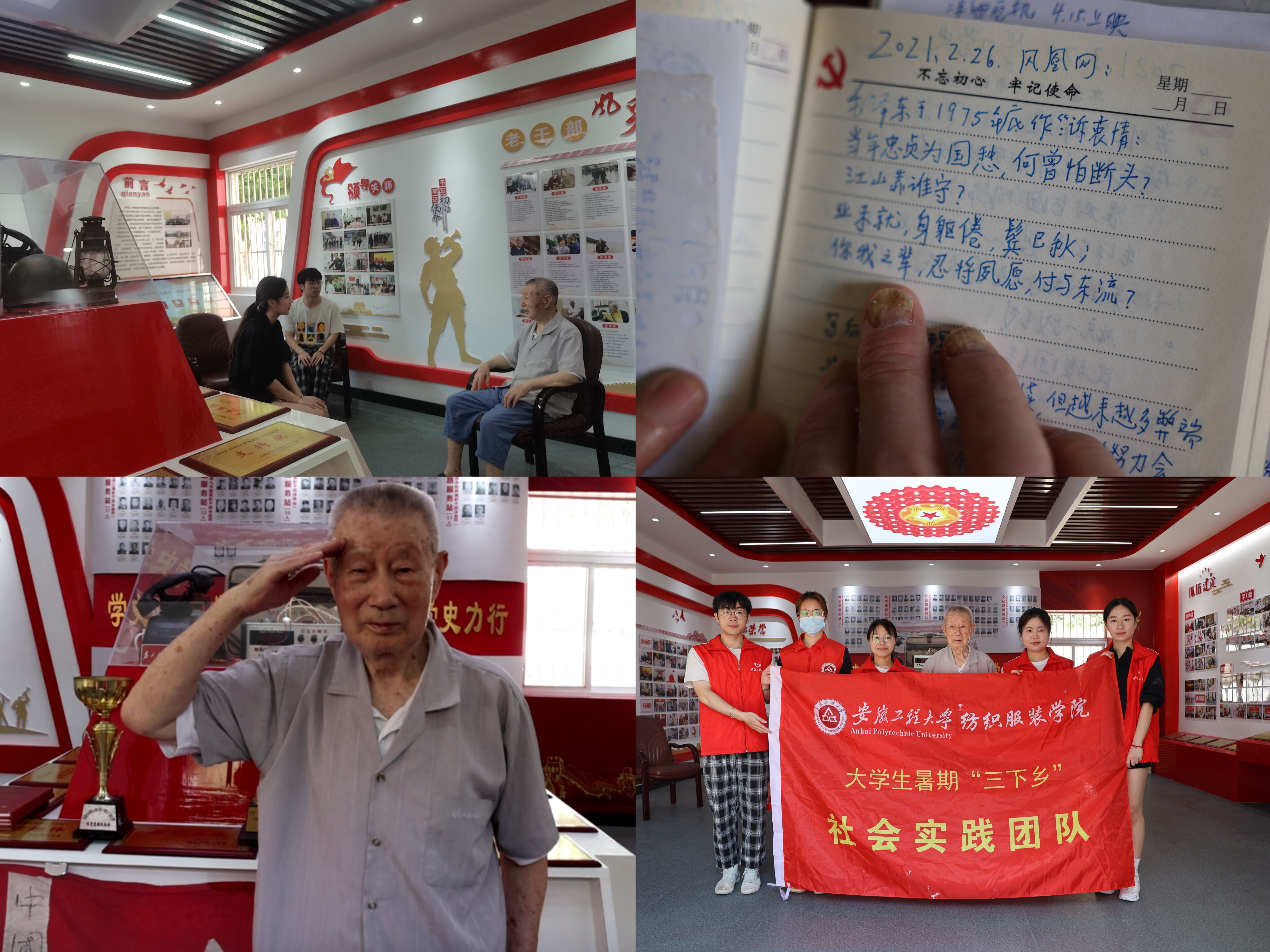 为进一步赓续红色血脉、弘扬革命传统,充分挖掘离休干部身上蕴藏的红色历史和宝贵精神财富,7月起至8月6日,纺织服装学院暑期“三下乡”社会实践团队以“桑榆心向党,青春暖人心”为主题,对安徽省军区芜湖第二离职干休所部分离休干部进行了深度红色挖掘,让老干部的重要史实、优良传统、革命精神留下来、传下去,让英雄的故事历久弥新。