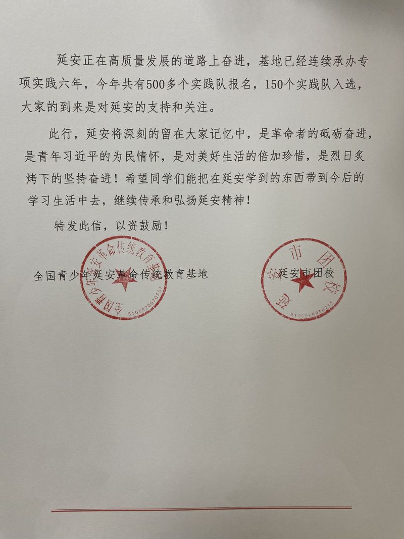信中表示,本次我校参与“追寻红色足迹 助力圣地发展”专项社会实践活动的5名大学生,在完成学习任务的基础上,积极参与社会公益服务,走深走实助力圣地发展,彰显了当代青年学子敢于吃苦、扎实肯干的精神风貌,并对同学们积极传承与弘扬延安精神提出殷切期望。