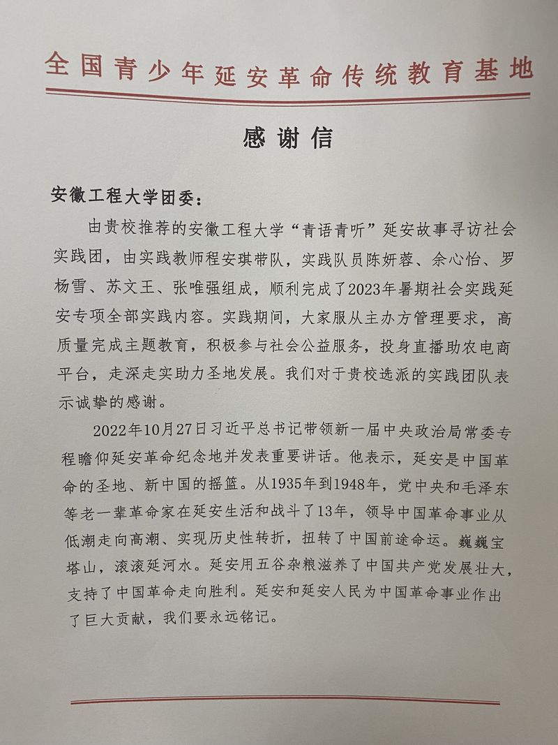 近日,全国青少年延安革命传统教育基地、延安市团校向我校发来感谢信,感谢我校对2023年全国大学生暑期“三下乡”社会实践“追寻红色足迹 助力圣地发展”专项活动的大力支持,并对我校“青语青听”延安故事寻访社会实践团成员的优异表现给予高度肯定。