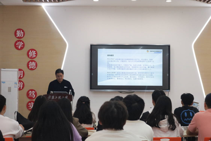 为深入学习宣传贯彻党的二十大精神,引导广大青少年有序参与社会主义民主政治实践,提高撰写提案的能力和水平,10月11日, 2023年青少年模拟政协提案征集活动专题培训会在校二课中心举行。芜湖市政协提案委员会副主任王有军应邀担任主讲嘉宾,全校24支参赛团队代表参加了本次培训。
