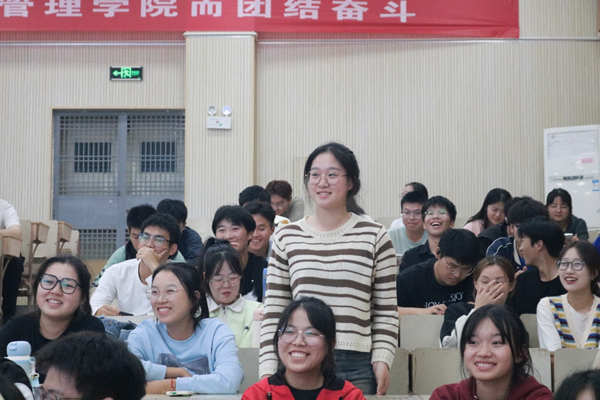 首先,范夏勋鼓励新生树立生涯发展意识、培养生涯规划能力,结合自身优势,树立目标、选好赛道,让大学成为人生阶梯最精彩的一部分。接着,行管221王淼、法学221李传旭、电商法221陶洁“面对面”与新生共同分享他们在安徽工程大学奋斗的青春故事。王淼同学从课上、课下、复习、备考四个方面详细介绍大学阶段的学习方法,指出要转变思想、开拓视野;李传旭同学指出大学是思想碰撞的地方、梦想绽放的地方,要提前制定合理的学习计划,从容不迫地让梦想扬帆起航。最后,在互动交流环节,新生们积极向学长学姐提出心中所惑。陶洁同学结合自己的大学生涯规划、在院级学生组织的经历和收获,耐心地答疑解惑,鼓励新生分阶段进行生涯规划,在脚踏实地的探索与实践中实现自我提升。
