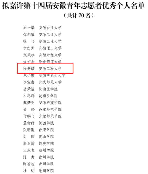 为深入学习贯彻习近平新时代中国特色社会主义思想,大力弘扬奉献、友爱、互助、进步的志愿精神,近日,团省委联合省文明办、省民政厅开展了第十四届安徽青年志愿者优秀个人、组织推荐嘉许活动。我校团委副书记(挂职)、数理与金融学院团委负责人程安琪获评第十四届安徽青年志愿者优秀个人。