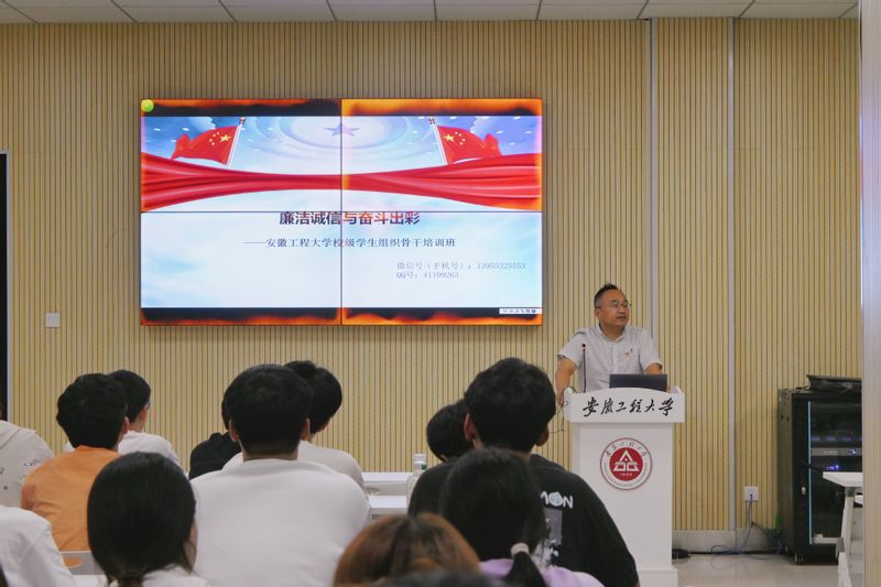 郭广春以《廉洁诚信与奋斗出彩》为主题,结合自身的工作经历,从三个方面讲述身为校级学生组织骨干如何做到廉洁诚信,要保持和增强政治性,培养关注党和国家的重大方针政策和国际国内时事热点的意识,及时通过丰富多彩的形式加强学习和交流;要保持和增强先进性,做好工作总结,坚持以学为本;要保持和增强群众性,更多地关心帮助普通和困难同学。他强调,作为学生骨干要积极奋斗,以联系和服务广大同学为先,充分发挥思想引领作用,为校园文化建设、学生成长发展提供支持。随后,青年讲师团成员姚岚为学生骨干开展了一场题为《解读中国式现代化》的理论宣讲,号召广大青年积极成为推动中国式现代化向前发展的重要力量。校宿管会副主任日语221班林可瑶表示:“作为学生骨干应该不断的提高自我,完善自我,以崭新的精神面貌、昂扬的奋进姿态投入到新学期的学习工作和生活中,争做新时代勇担当肯奉献的学生干部。”