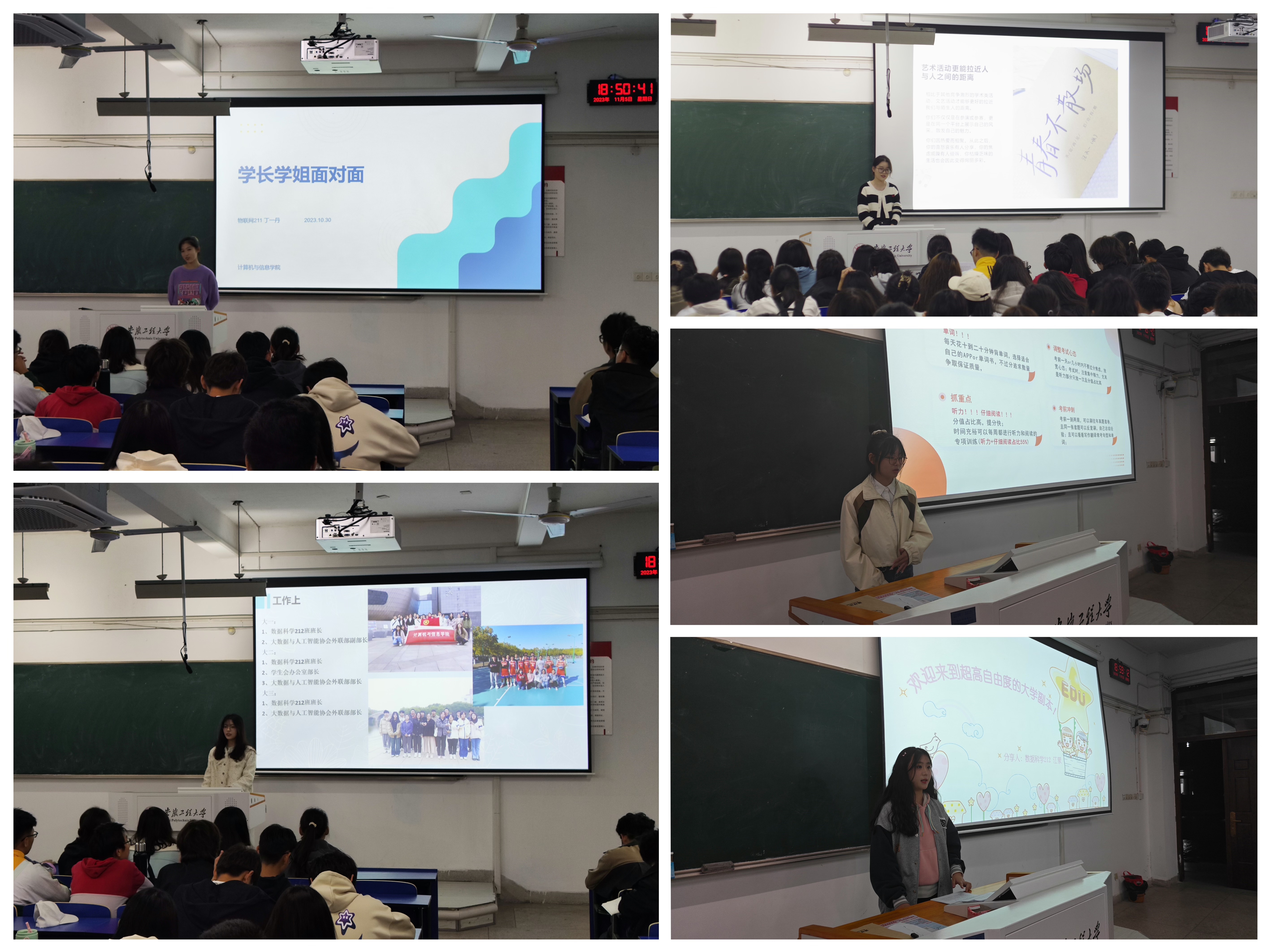 为进一步推动“三全六专”育人实践工作,助力新生明确目标、找准方向,树立远大理想,充分发挥朋辈榜样引导的力量,11月5日,计算机与信息学院以“学”起来为主题,开展大学生涯规划系列首场“学长学姐面对面”经验分享会。共邀请到7位优秀学生从人生规划、专业学习、参加竞赛以及学习习惯养成等方面讲述了自身感悟,面对面分享在国家奖学金、学科竞赛、志愿服务、体育竞赛、学生组织表现突出等方面收获的成果。
