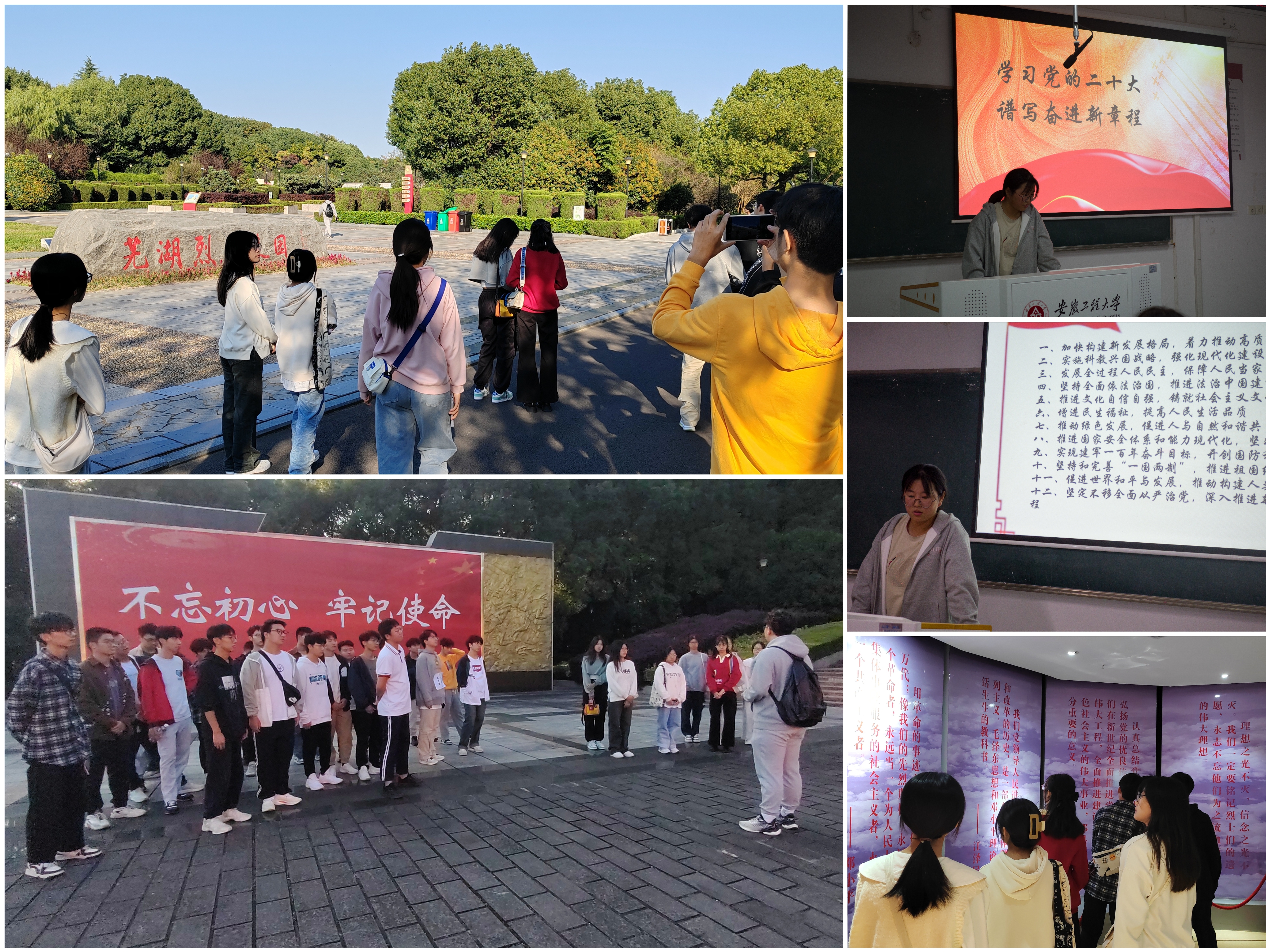 计算机232团支部开展了“缅怀先烈,牢记使命”主题团日活动。同学们集体参观了芜湖市烈士纪念碑和纪念馆,了解先辈们的光荣事迹。沿途领略城市风光的同时,辅导员详细讲解了团旗、团徽的使用规范,与同学们交流了大学生涯规划思路,就如何认识自我、如何确立大学发展目标等问题展开讨论,指引学生发现自我长处,了解不足,引导新生对大学生涯进行初步规划。