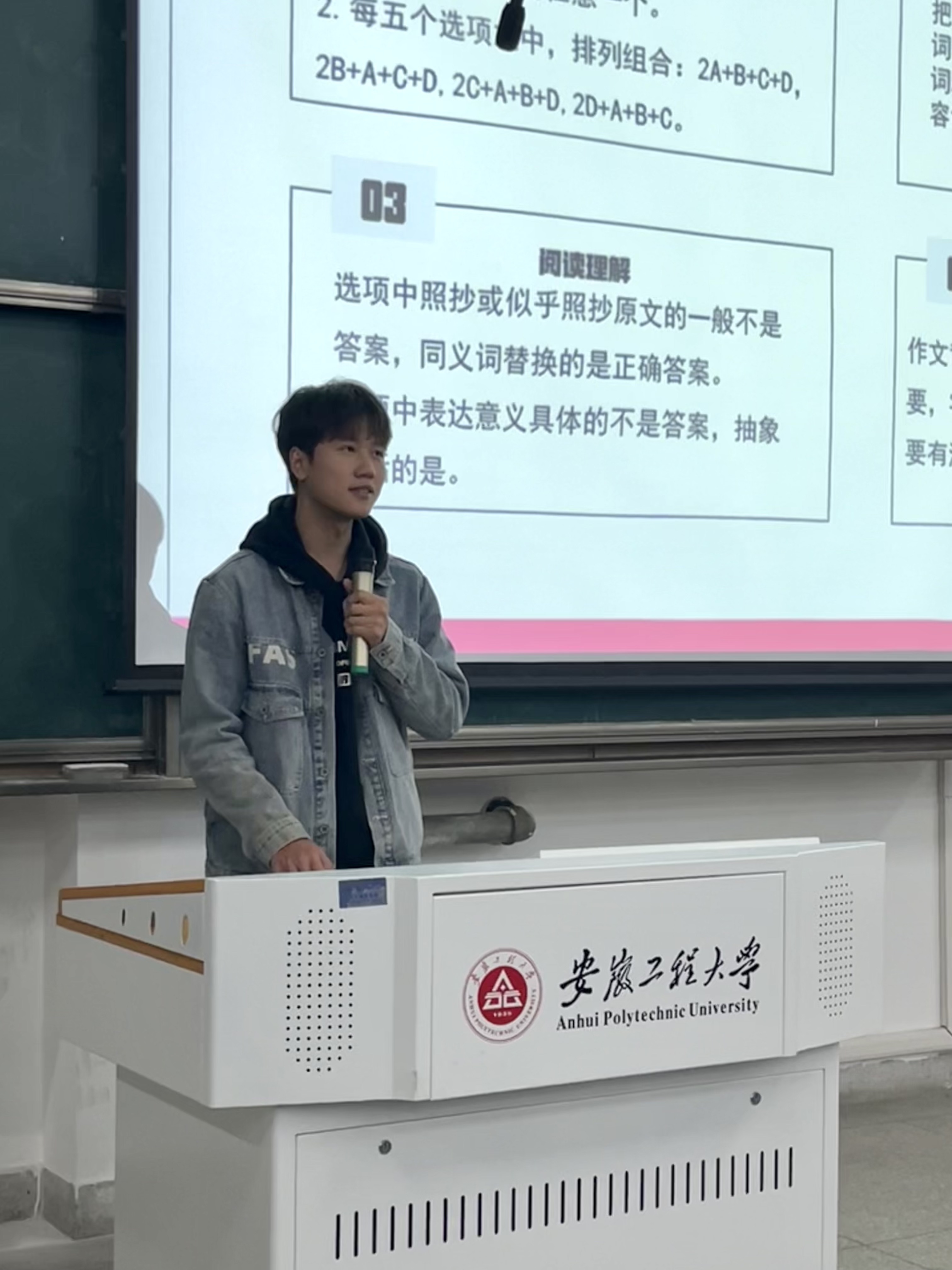 张志耀同学从题型解析、实战经验等方面阐述通过四级考试的关键点,并从听力、阅读、写作、翻译四个方面给出具体建议,提醒同学们合理安排做题时间。李传旭同学介绍了应试技巧和考试注意事项,提出要多背单词、多刷真题、多总结,鼓励同学们在英语学习中惜时、专心、苦读。董一蕃同学从备考方法、考试技巧及心态调整等方面讲述如何在备考的过程中提升英语学习能力、阅读能力、听力能力和写作能力。