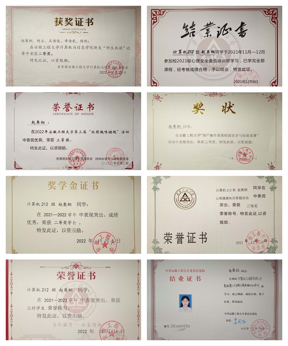 担任心理委员期间,赵奥桐努力做好心理建设方面的工作,被评为优秀心理委员、心理委员标兵和校十佳心理委员。学习专业领域方面也十分认真,曾获得校二等奖学金和校三好学生。在政治态度方面,赵奥桐获得了优秀共青团员称号,在做好一名合格的共青团员的同时,也积极向党组织靠拢,作为入党积极分子参加党课培训。课外,赵奥桐也积极参加各项比赛,在学生工作和志愿服务方面发挥作用,力求不断地提高自己的综合能力,全面发展,砥砺前行。