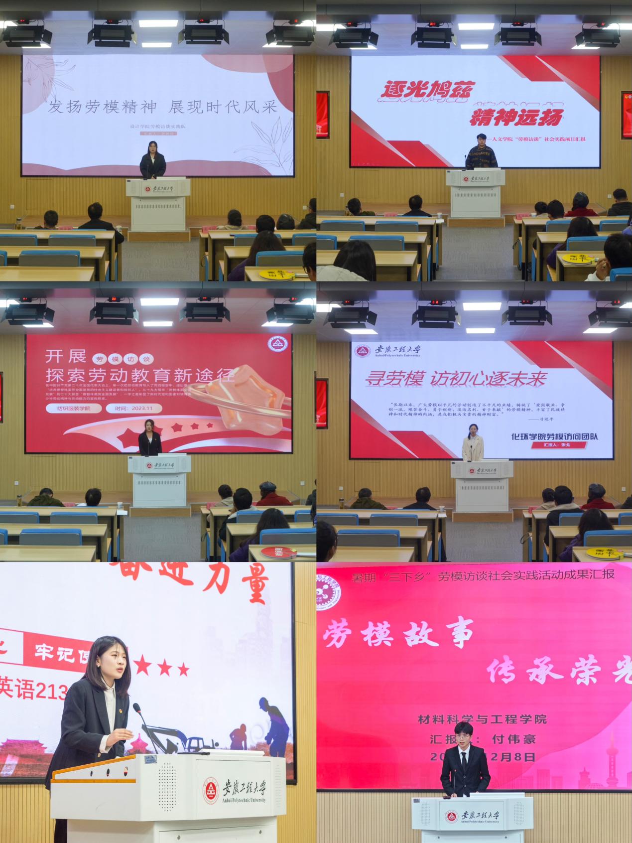 会议伊始,程安琪领学了习近平总书记关于劳模精神、劳动精神和工匠精神的重要论述。在现场汇报环节,各学院实践团队从访谈安排、访谈成果、感悟心得、工作设想等方面进行了精彩汇报。15支“劳模访谈”实践团队共计采访了芜湖市范围内的500余名国家级、省级、市级劳模,撰写了劳模名录和劳模访谈录,形成了感悟劳模精神、劳动精神、工匠精神的一系列心得体会。