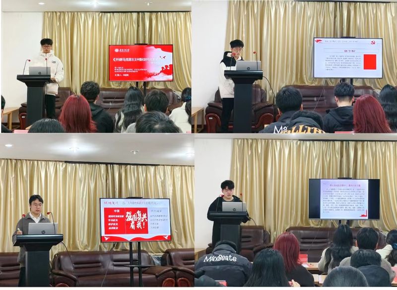校院两级学生会成员分成四个读书小组,在前期自学的基础上,依次交流分享读书感悟。各读书小组代表分别以《开辟马克思主义中国化时代化新境界》《“坚强核心”专题》《中国式现代化是强国建设民族复兴的康庄大道》《青年要自觉践行社会主义核心价值观》为主题进行读书分享。