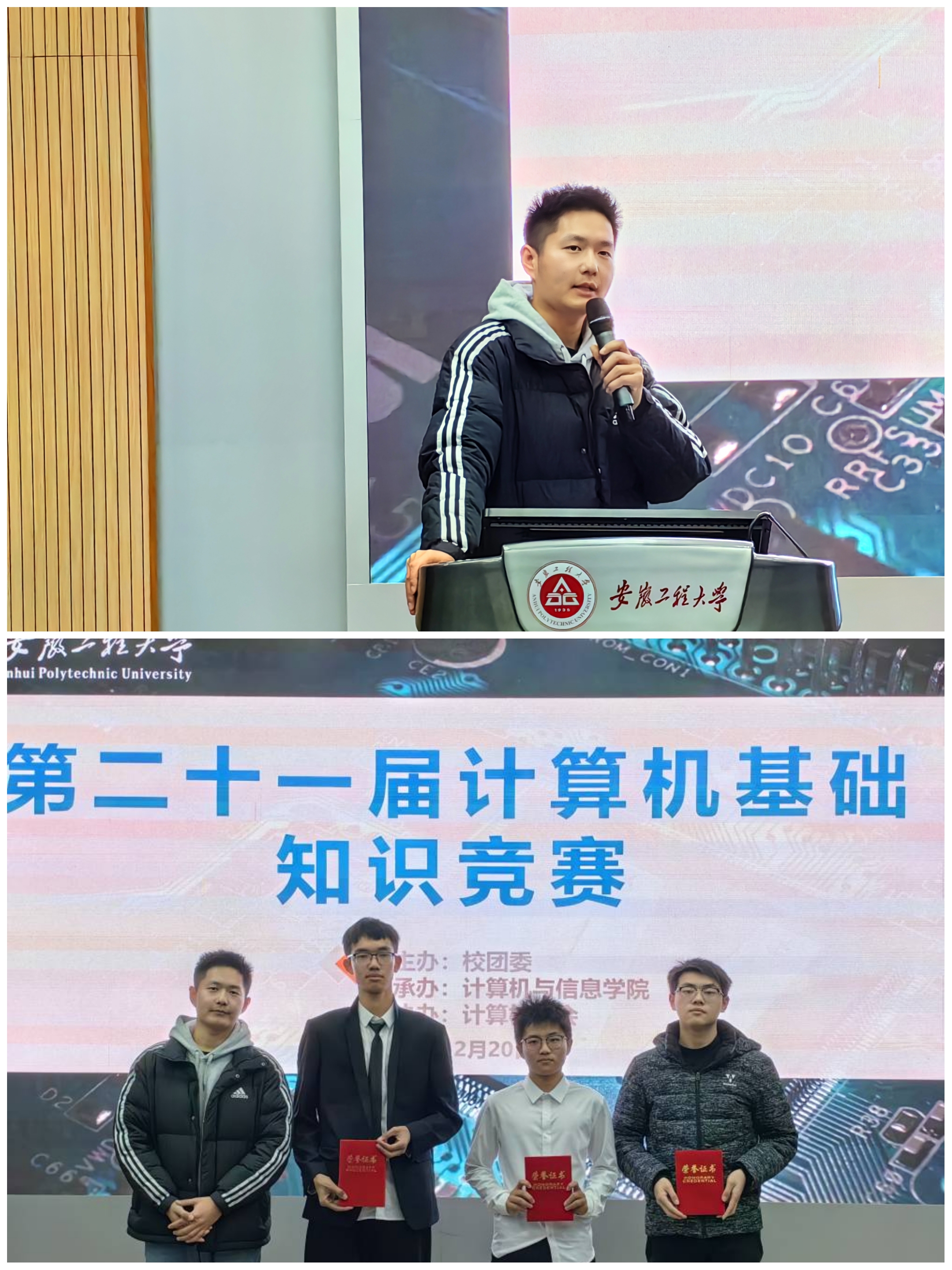 为持续推进“三全六专”育人实践,营造浓厚校园学习氛围,进一步深化“以赛代练,以赛促学” 理念,由校团委主办,计算机与信息学院承办,学校第二十一届计算机基础知识竞赛决赛于12月20日举行。校团委宣传科科长孙琳瑶、计算机与信息学院团委书记吕寅参加,计算机与信息学院教师季昭康担任仲裁。电气工程学院代表队获一等奖,材料科学与工程学院代表队、经济与管理学院代表队获二等奖,计算机与信息学院代表队、机械工程学院代表队、生物与食品工程学院代表队获三等奖。