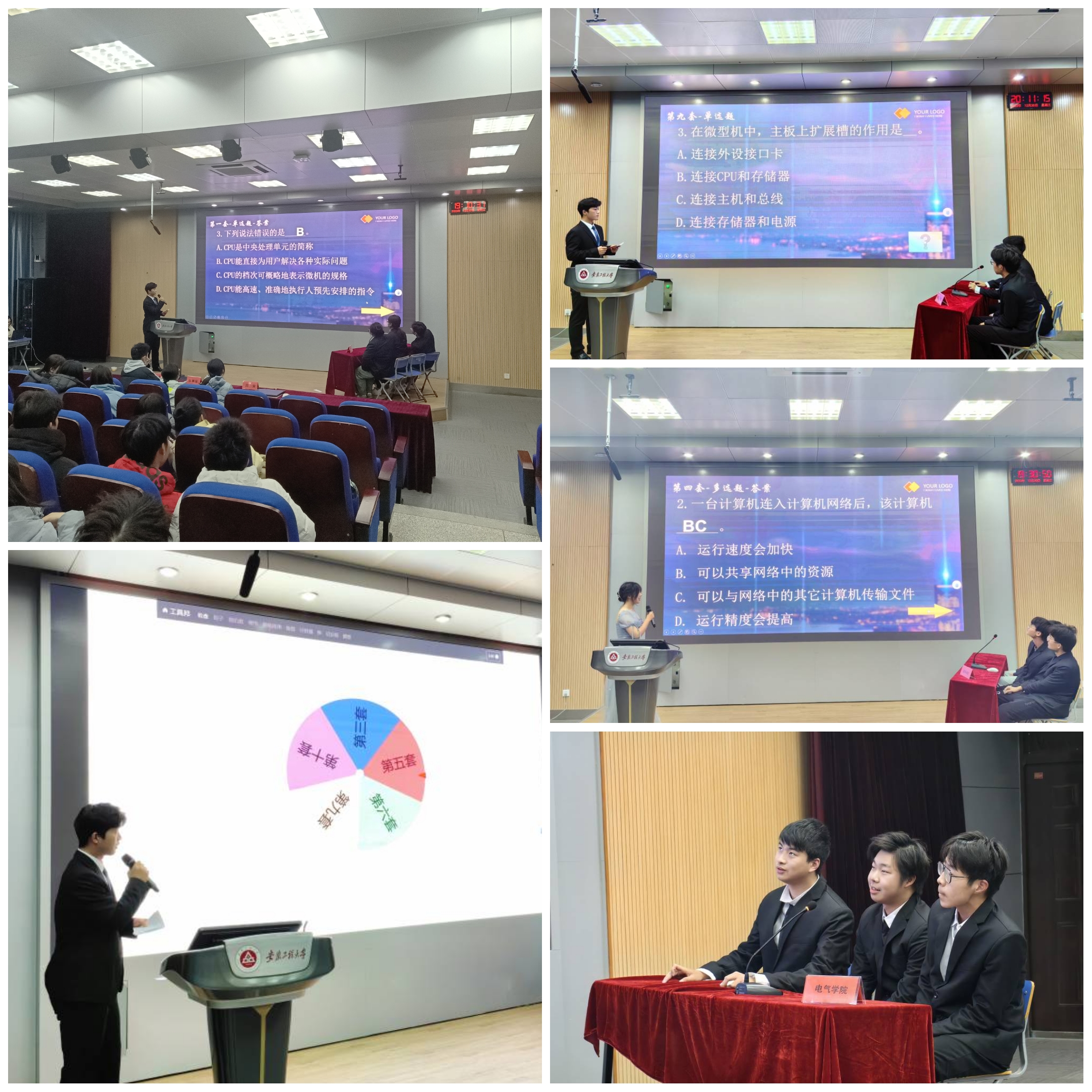 决赛现场,按照抽签顺序,进行现场抽题,实行“快问快答”,每道题20秒,共分成单选题、多选题、判断题等。同学们凭借扎实的计算机基础知识,灵活的思维和出色的应变能力,充分展示了自己的才华和实力。上半场比赛开始后选手们迅速进入比赛状态,比赛现场井然有序。比赛过程中,大家都信心十足。中场的观众抢答环节气氛非常热烈。在校团委、各学院的大力支持下,选手们的认真参与下,此次竞赛圆满结束。