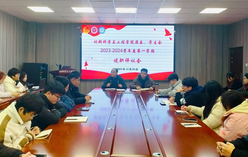 为进一步落实学校“三抓”工作要求,落实团学组织述职评议制度,加强学生骨干思想政治建设、组织能力建设,12月28日晚,材料科学与工程学院团委学生会2023-2024学年第一学期述职评议会在B座216召开。学院党委副书记方玖胜出席会议并讲话,辅导员和各班班长、团支书参加会议。学院团委、学生会主席团及各部门主要负责人作述职报告。会议由学院团委兼职副书记田园老师主持。