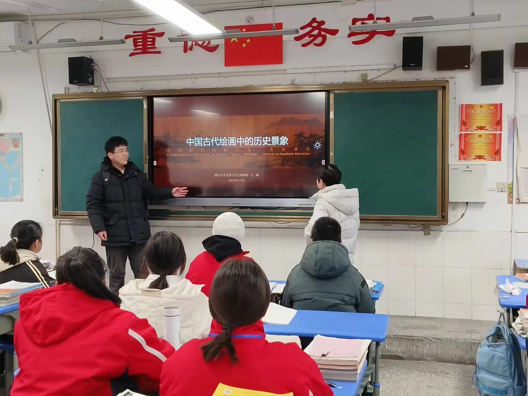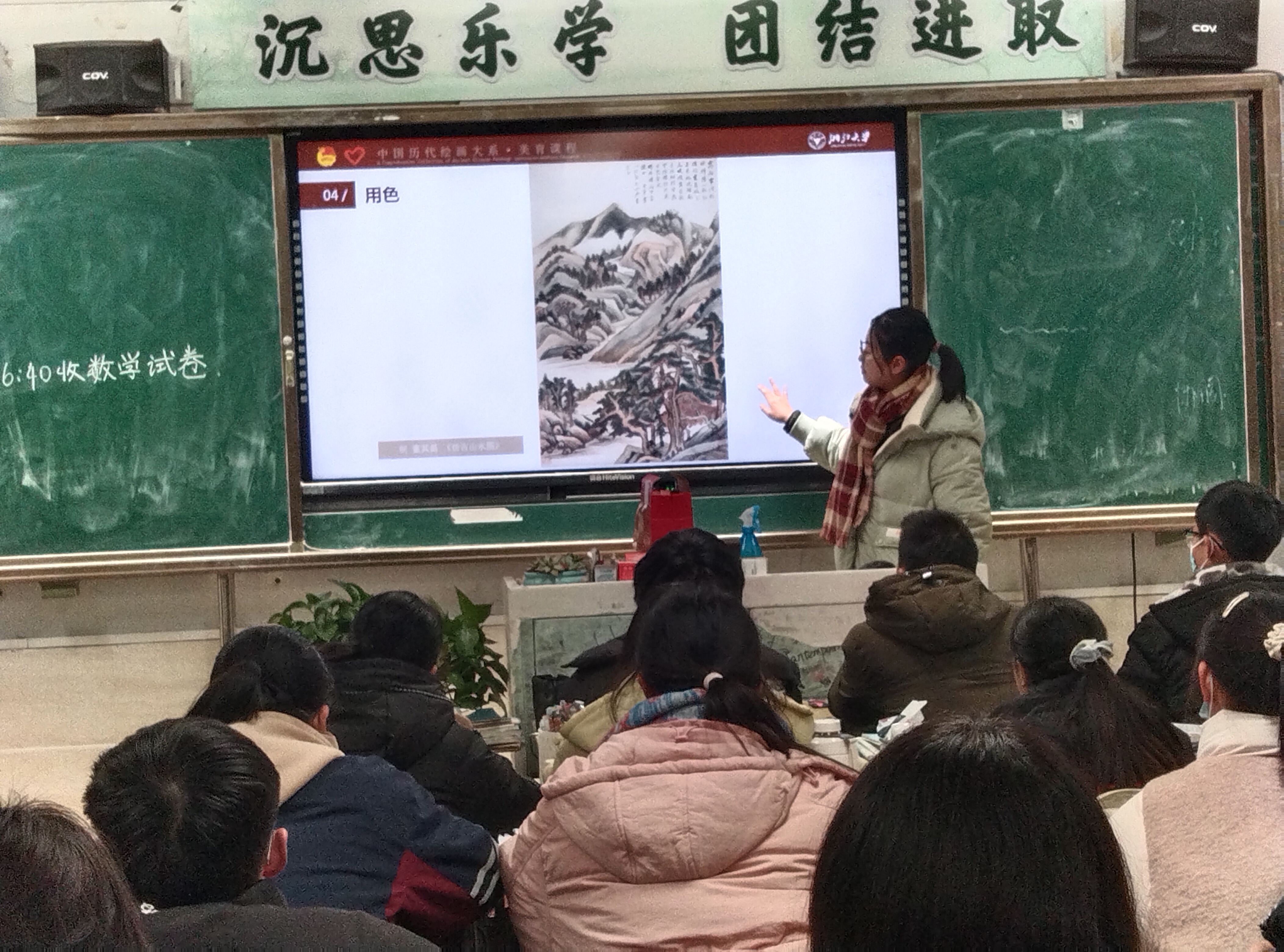 根据活动安排,团队结合前期准备的宣讲内容,以及参观和学习的成果,来到团队成员法学231李亦涵、电商法231张宝丰的高中母校淮南一中、三中,开展中国历代绘画大系全国大学生志愿宣讲。两位同学系统地介绍了中国绘画的发展史、流派、风格特点,并通过展示名家作品,形象地分析了中国传统绘画中的绘画技法与文化内涵。此外,团队还精心设置了趣味竞答等游戏环节,现场气氛热烈。高中生们在沉浸式、互动式、趣味性的体验中,感悟与领略到中国优秀传统文化的魅力。